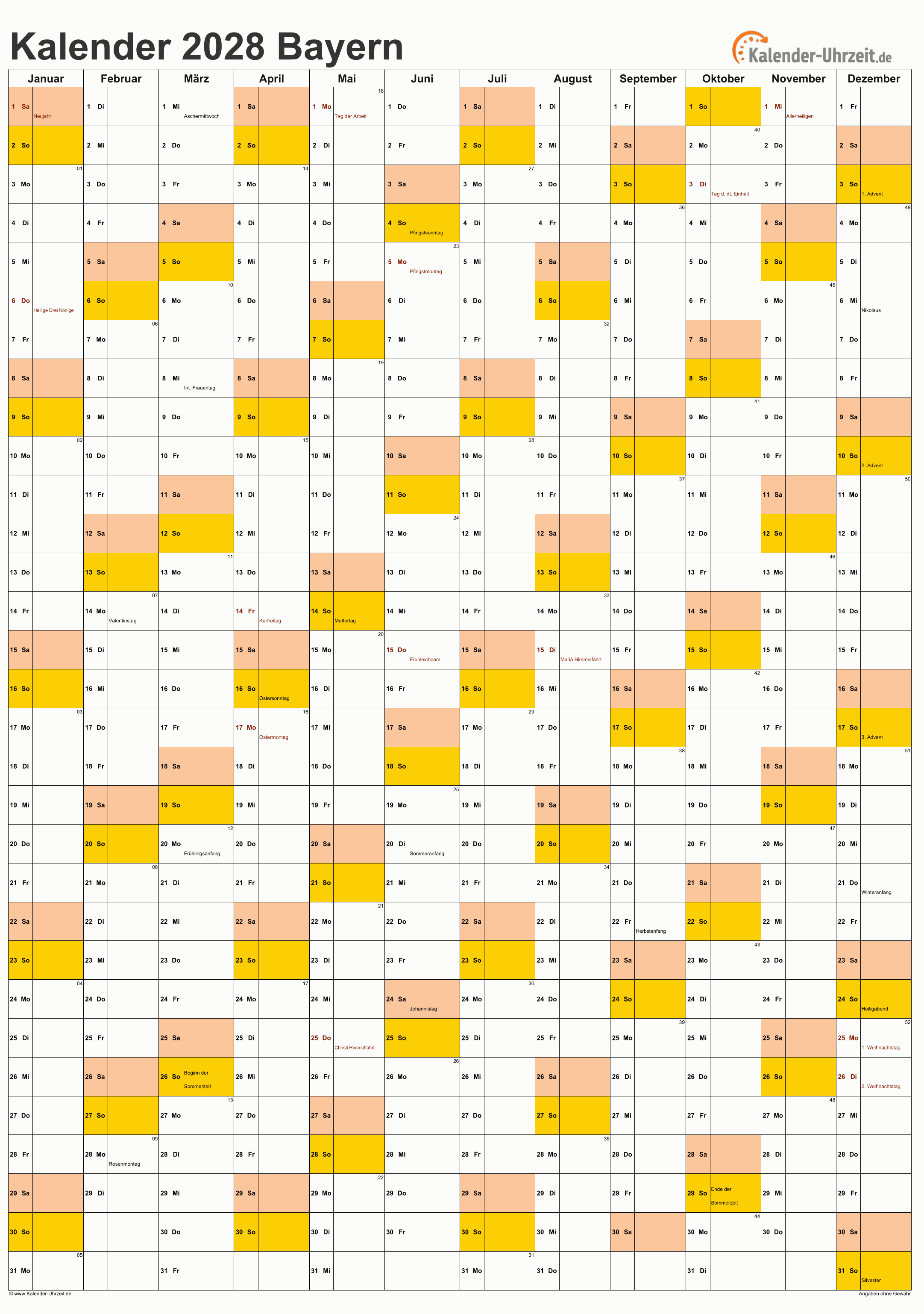 Feiertage 2028 Bayern - Jahreskalender als Excel oder PDF - Kostenlos - DIN A4 Hochformat, 1-seitig