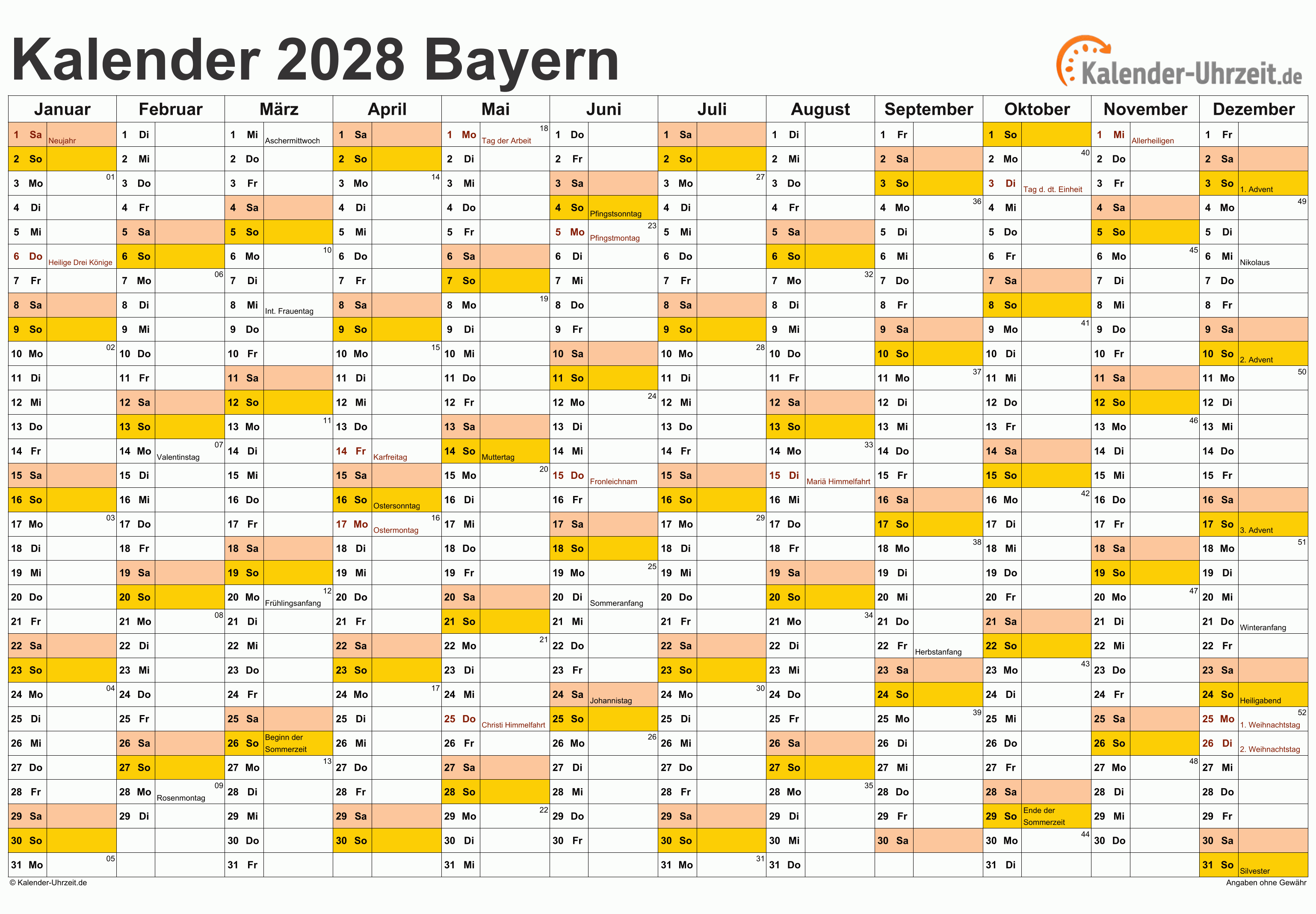 Feiertage 2028 Bayern - Kalender als PDF oder EXCEL - Kostenlos - DIN A4 Querformat, 1-seitig