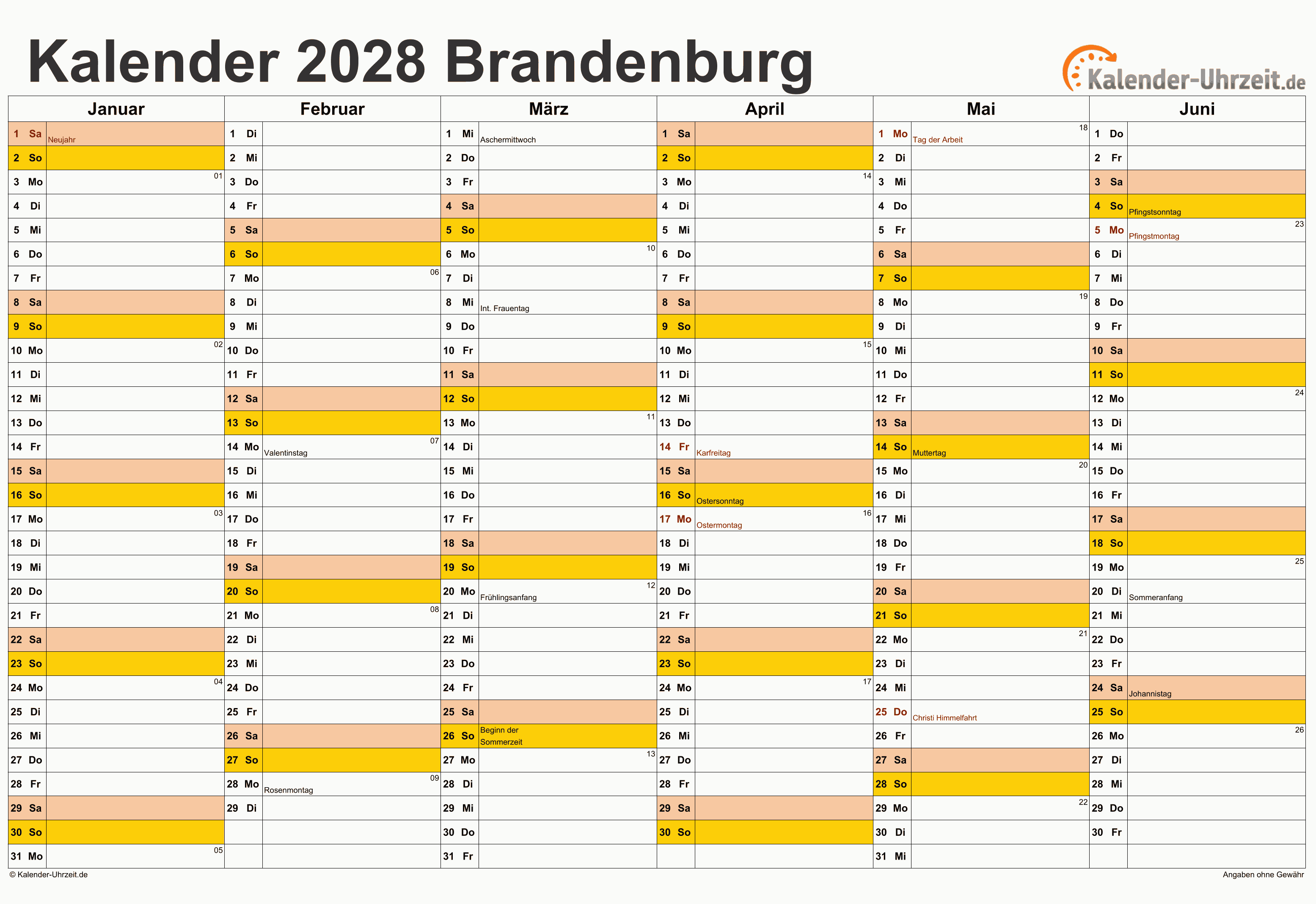 Feiertage 2028 Brandenburg - Halbjahreskalender als Excel oder PDF - Kostenlos - A4 Querformat, 2-seitig