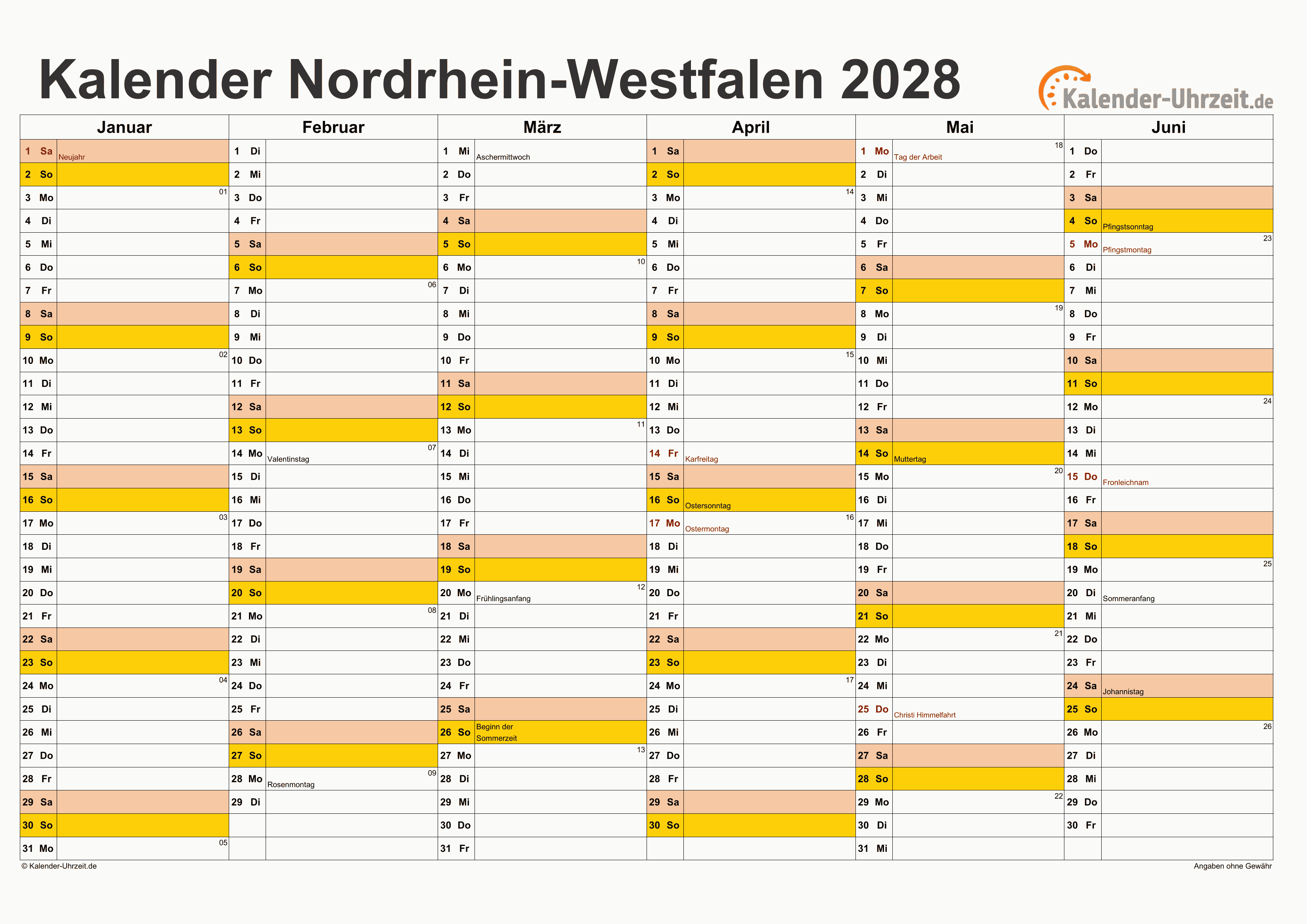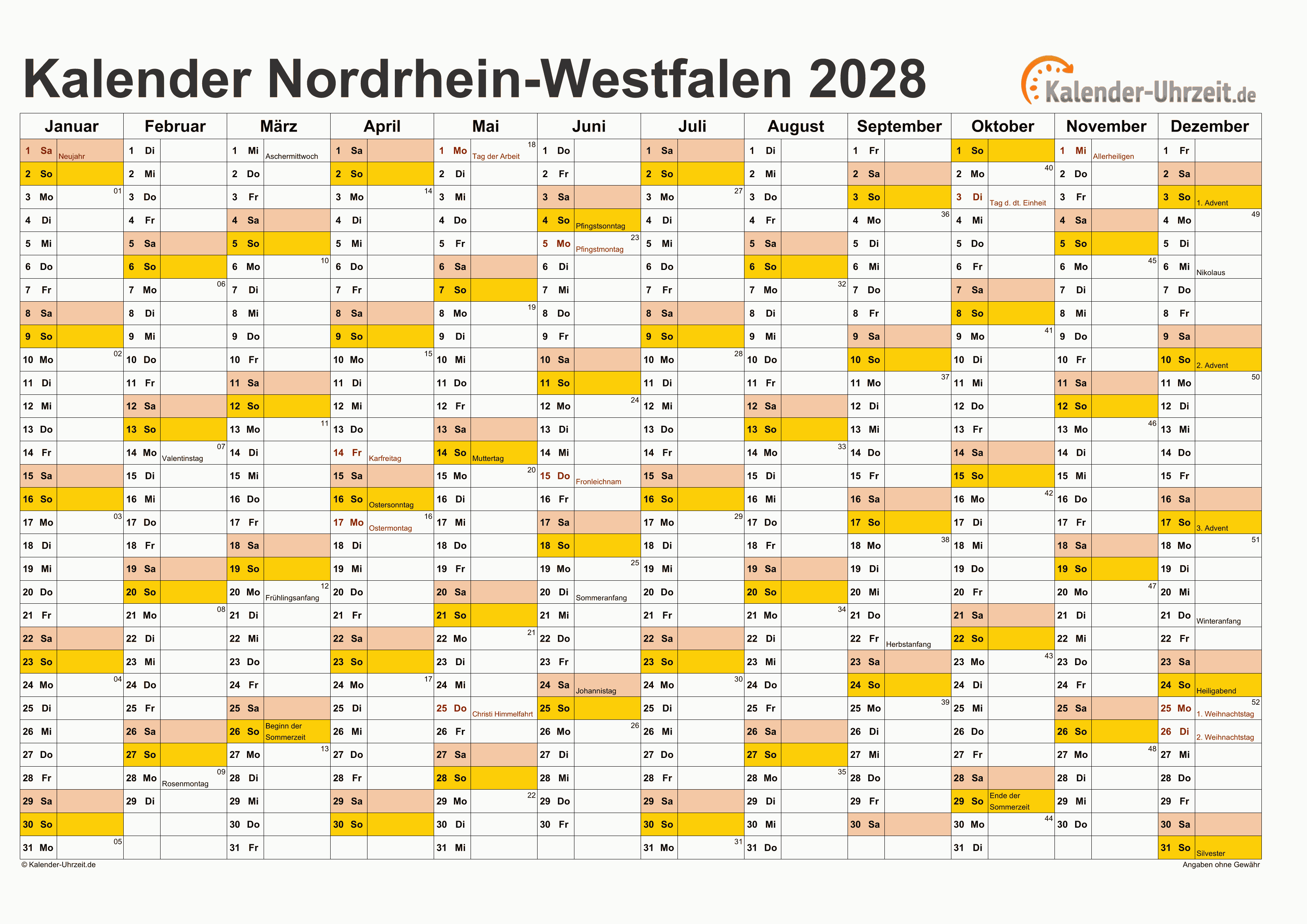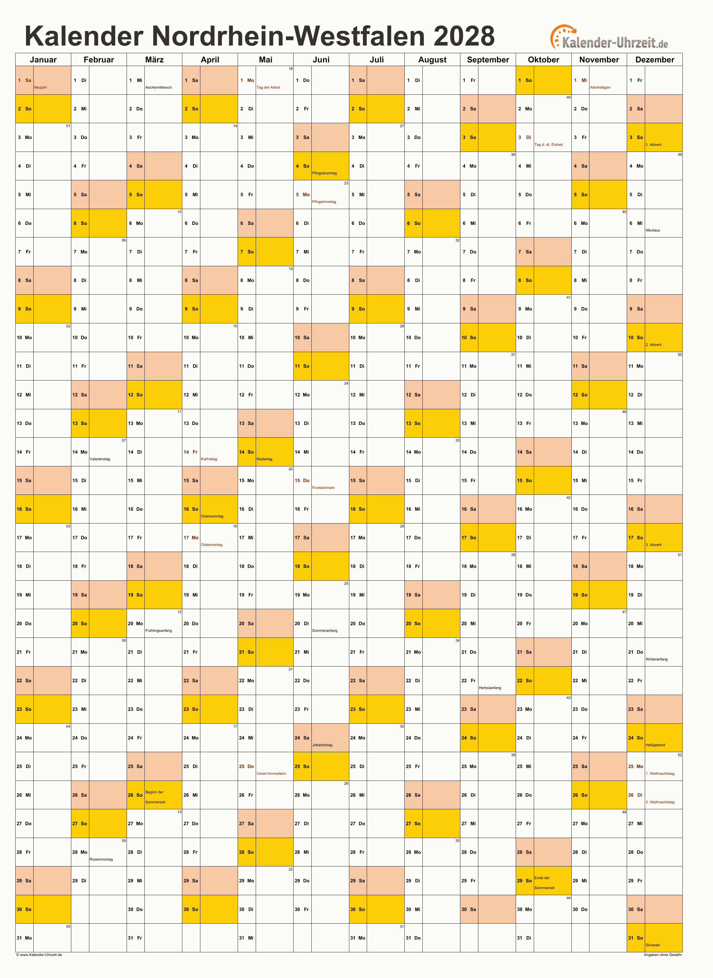 Feiertage 2028 Nordrhein-Westfalen: Kalender zum Ausdrucken