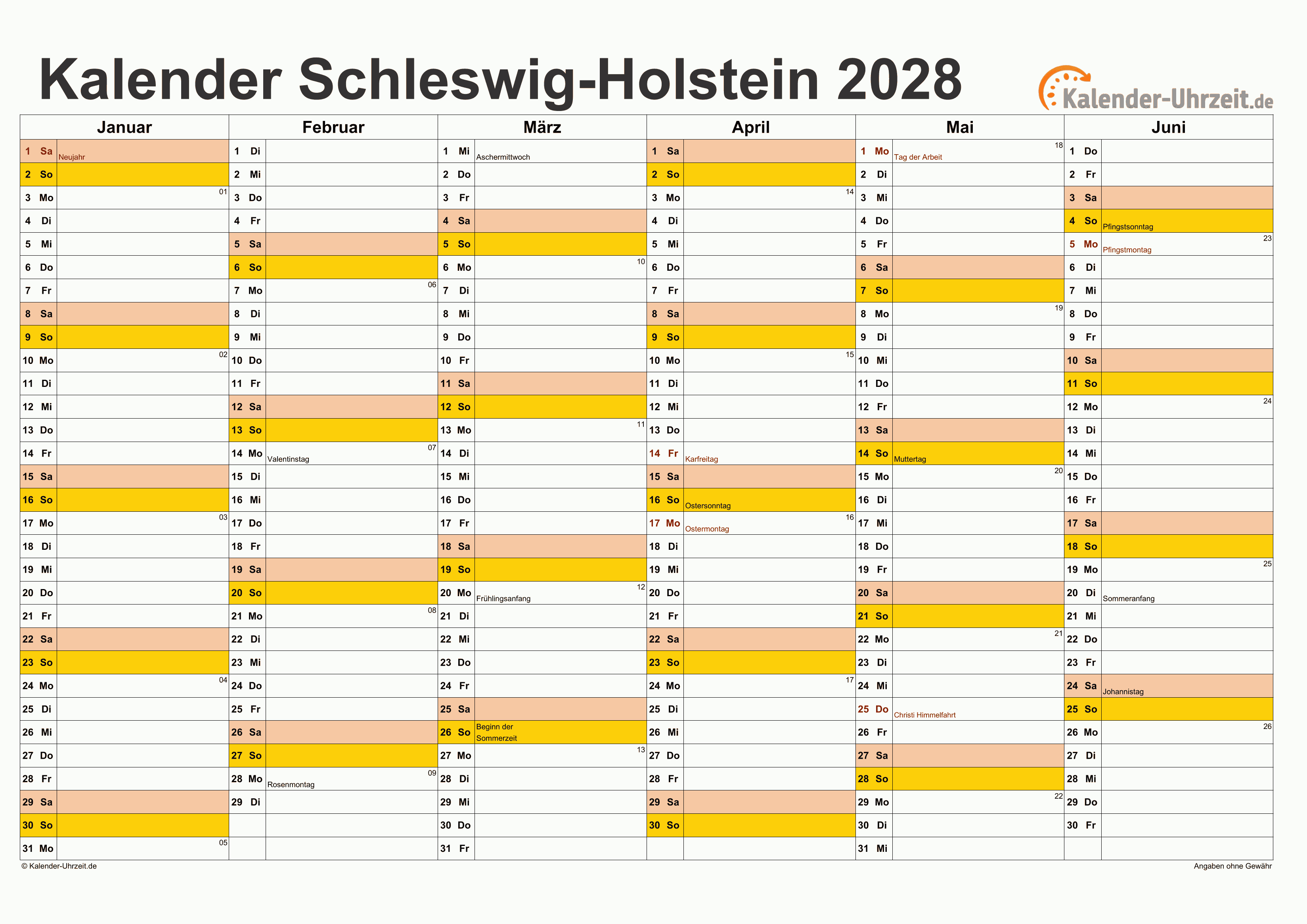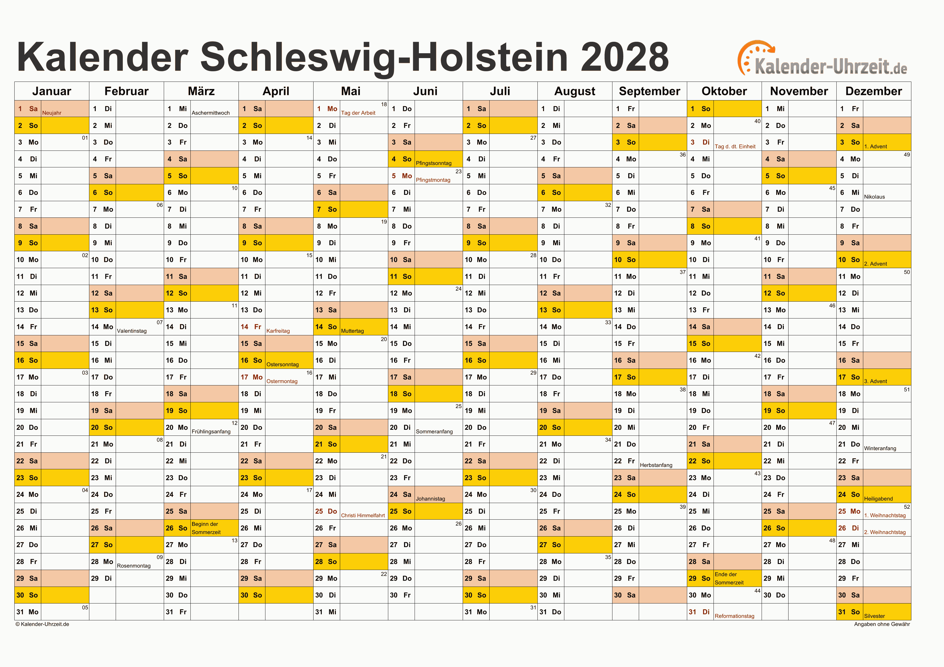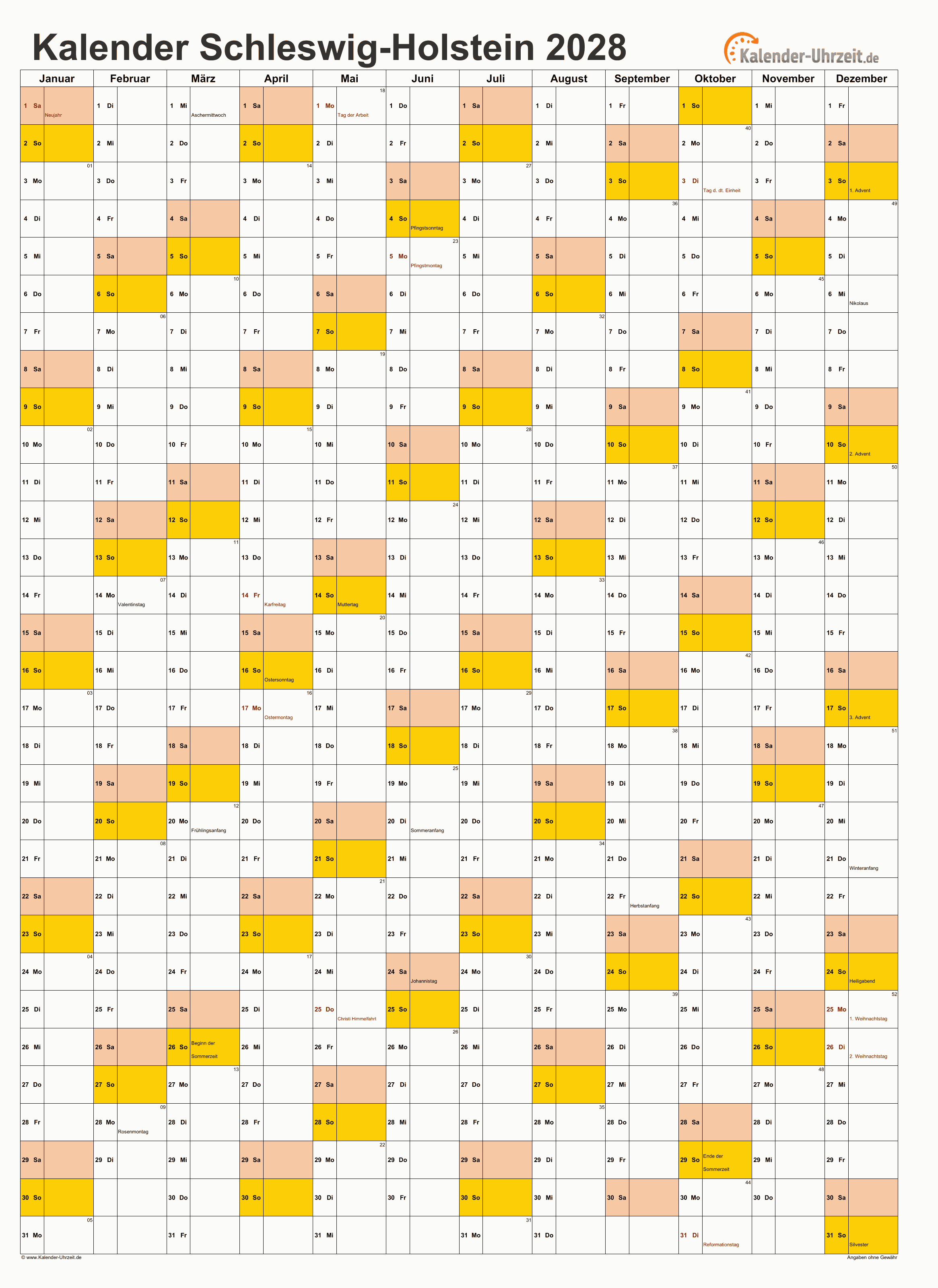 Feiertage 2028 Schleswig-Holstein: Kalender zum Ausdrucken