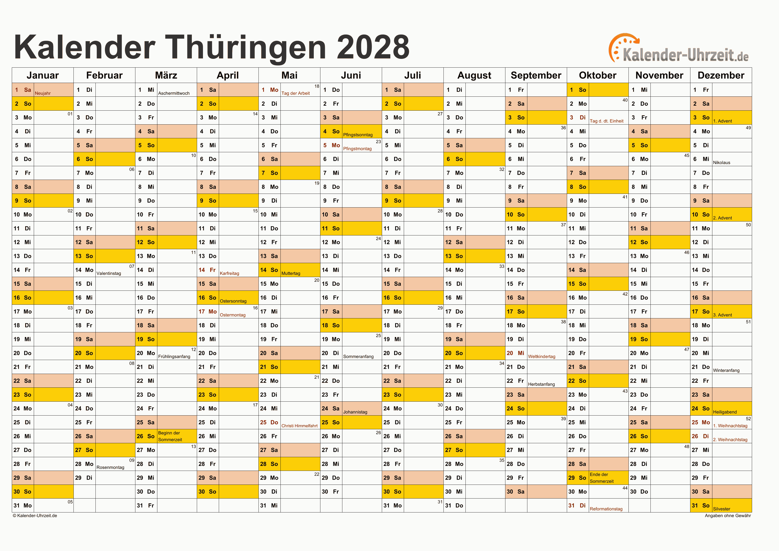 Kalender & Feiertage 2028 Thüringen - DIN A4 Querformat, 1-seitig