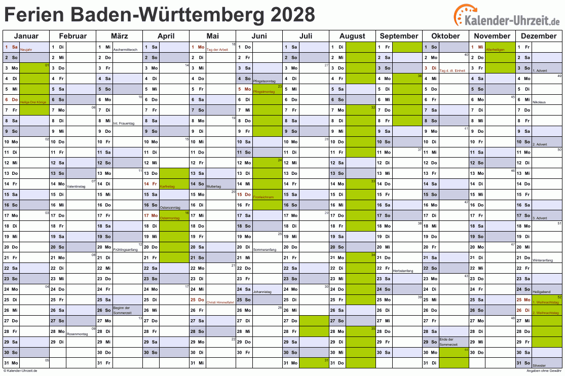 Ferien Baden-Württemberg 2028 im Kalender