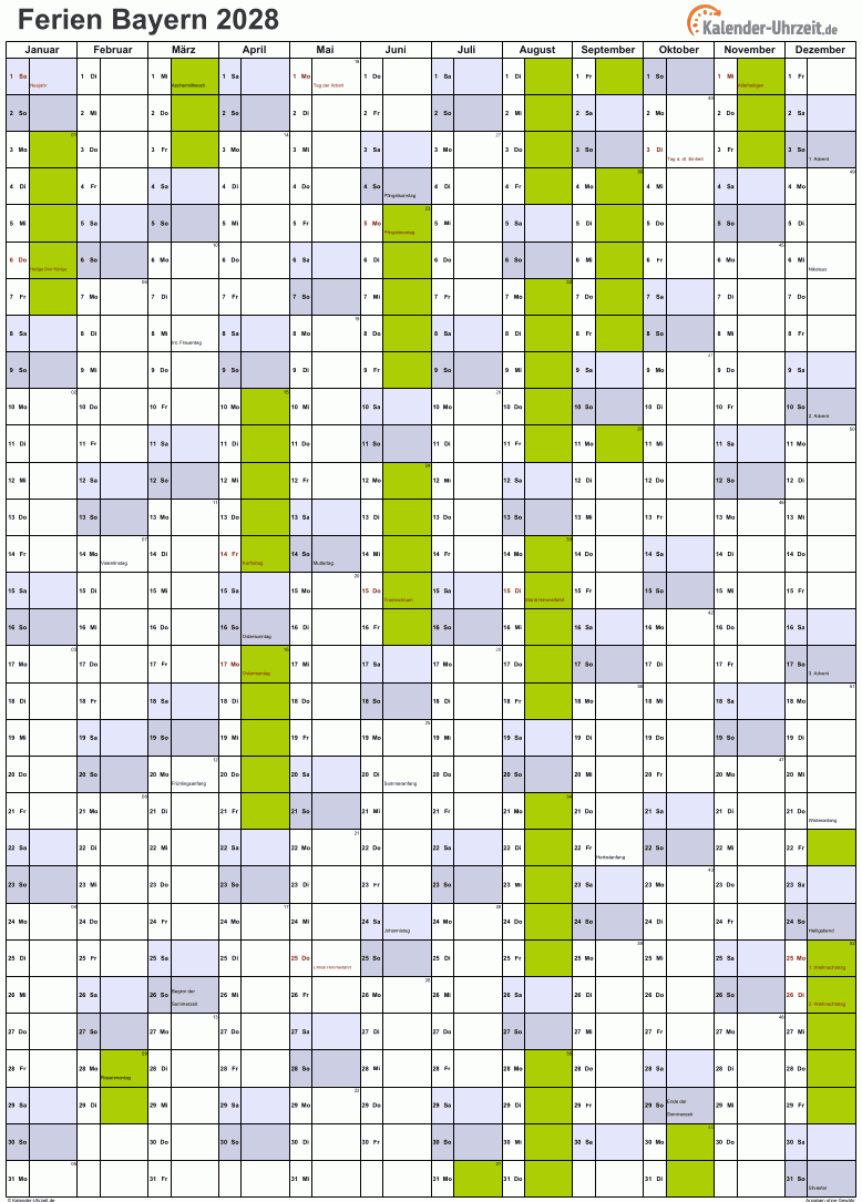 Jahreskalender 2028 Bayern mit Ferien als Excel oder PDF ausdrucken DIN A4 Hochformat, 1-seitig