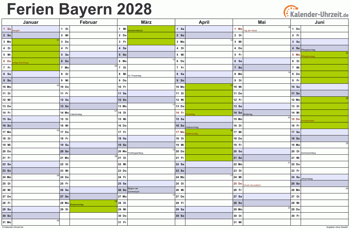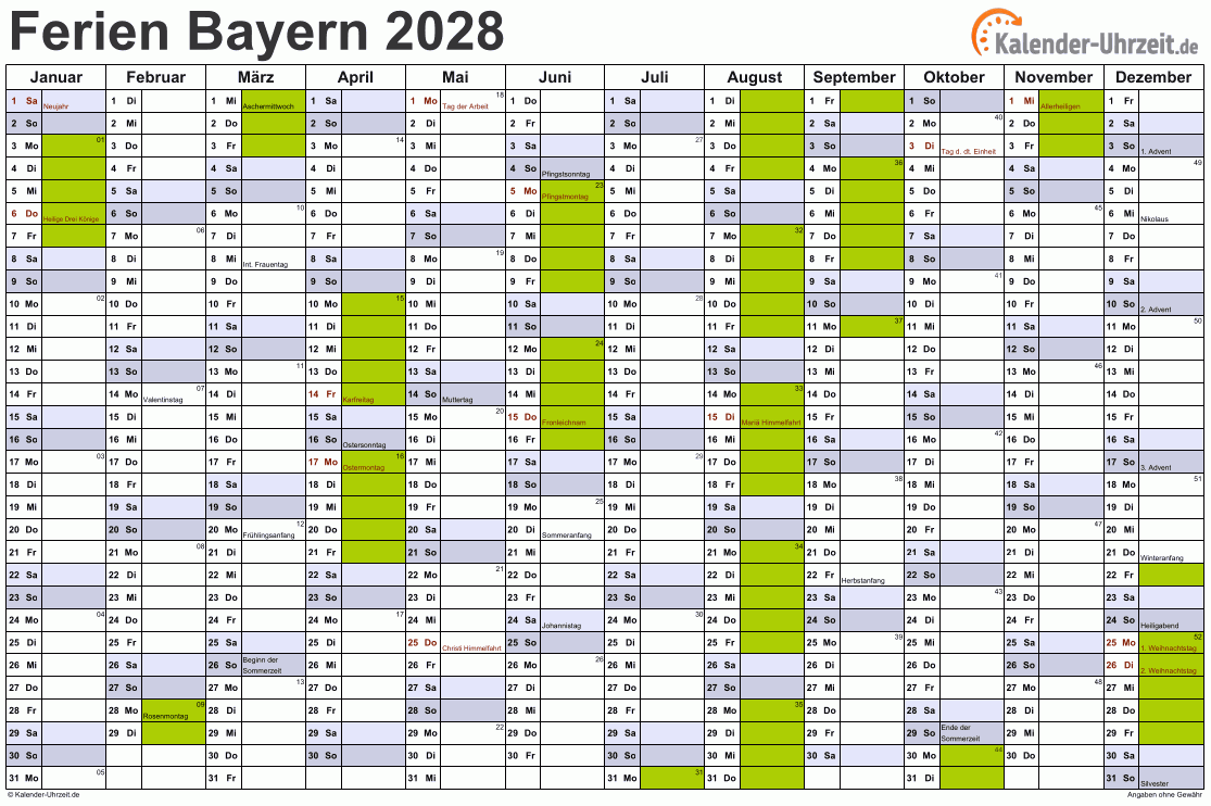Ferien 2028 Bayern - DIN A4 Querformat, 1-seitig