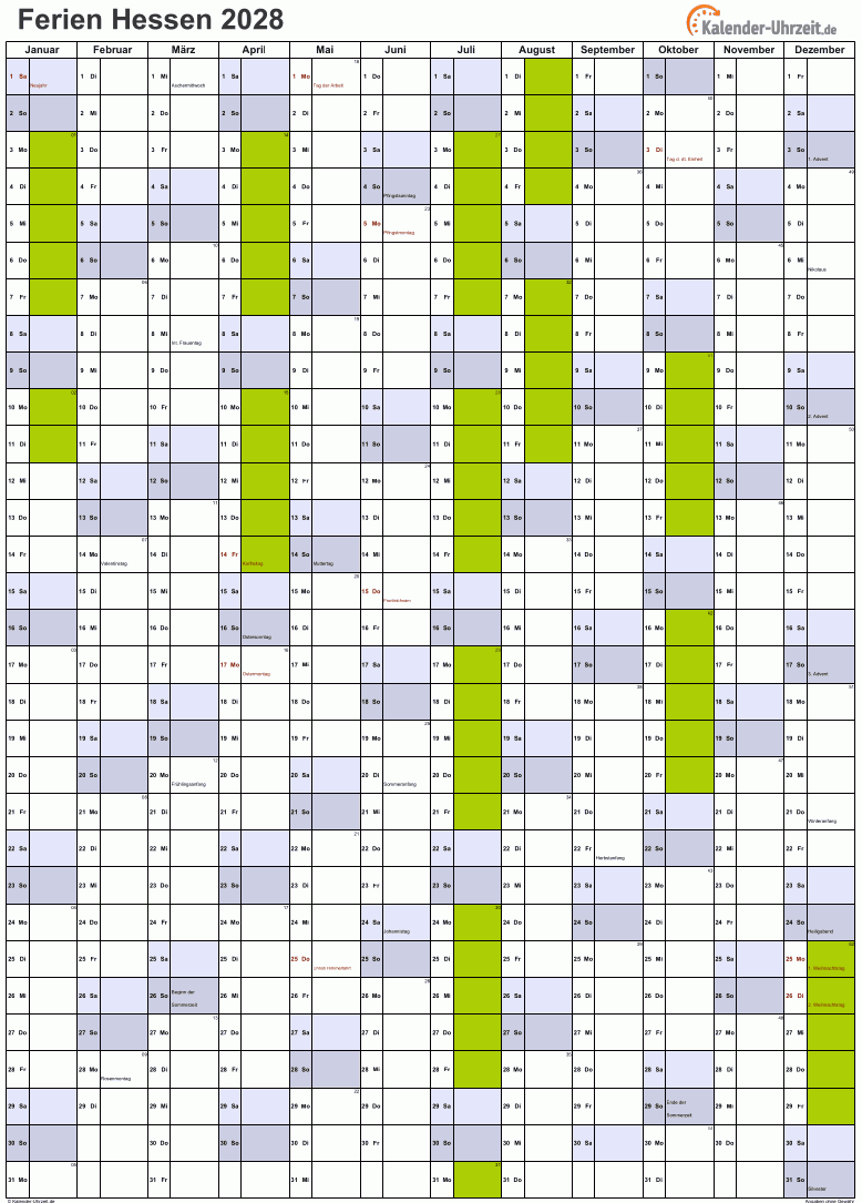 Jahreskalender 2028 Hessen mit Ferien als Excel oder PDF ausdrucken DIN A4 Hochformat, 1-seitig
