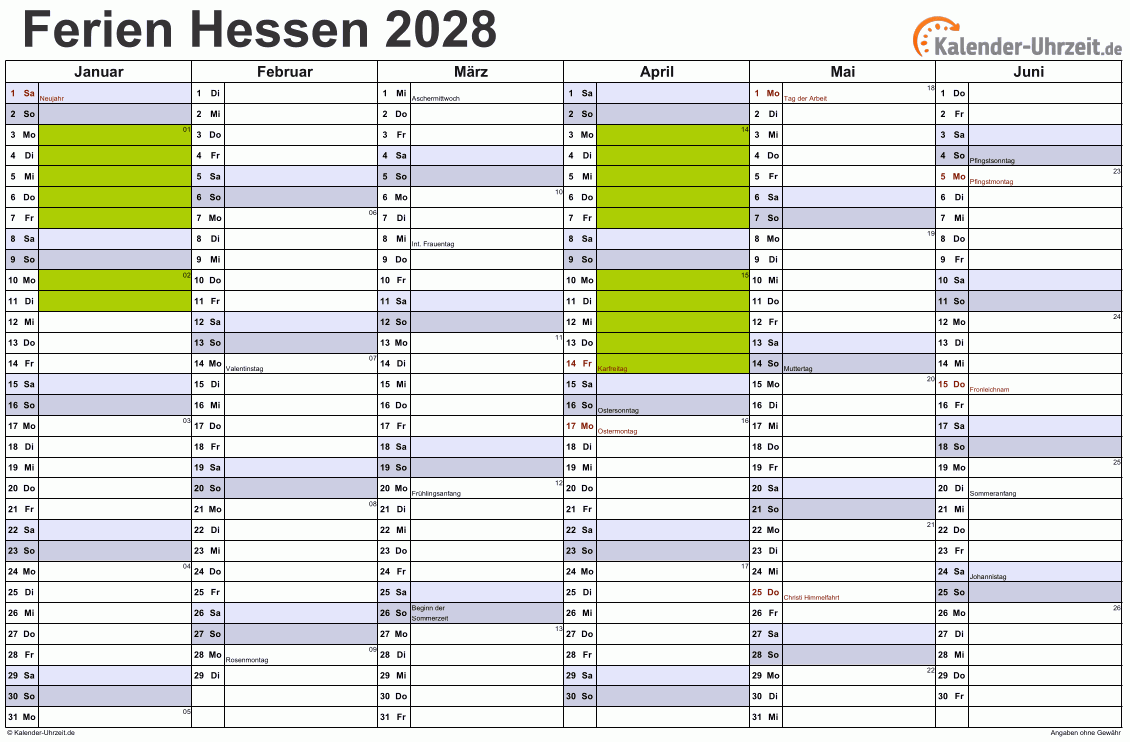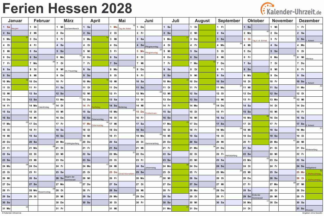 Ferien 2028 Hessen - DIN A4 Querformat, 1-seitig