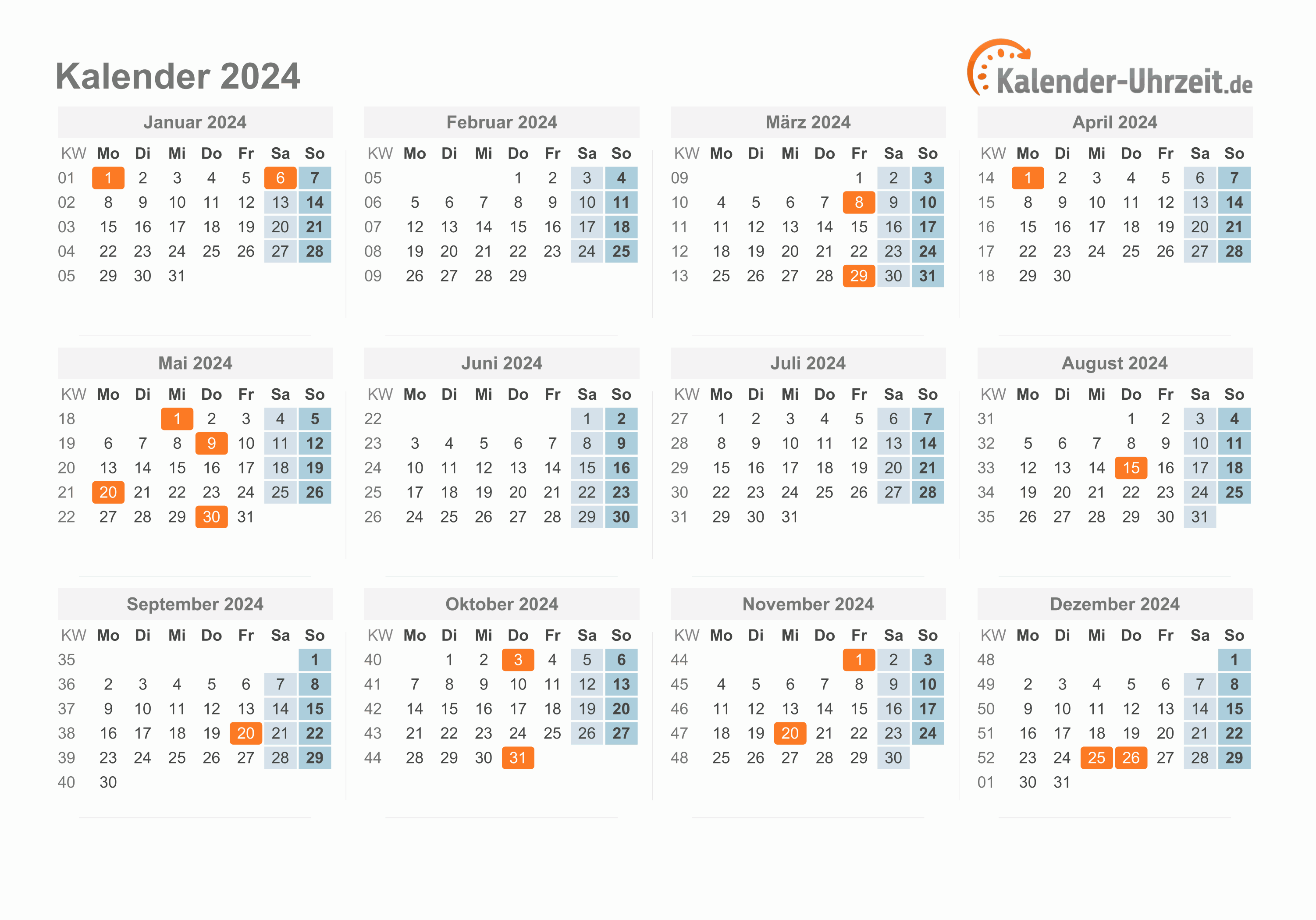 Hier finden Sie eine kleine Auswahl unserer Kalender 2024 mit Feiertagen und Kalenderwochen als PDF- oder EXCEL-Datei. Weiterhin haben wir viele A4- und A5-Vorlagen als PDF-Kalender 2024 sowie Excel-Kalender 2024 für Sie vorbereitet. Mit unserem Kalendergenerator können Sie schnell und einfach individuelle Jahres-, Quartals- und Monatskalender erstellen. Unser Angebot ist für Sie kostenlos!