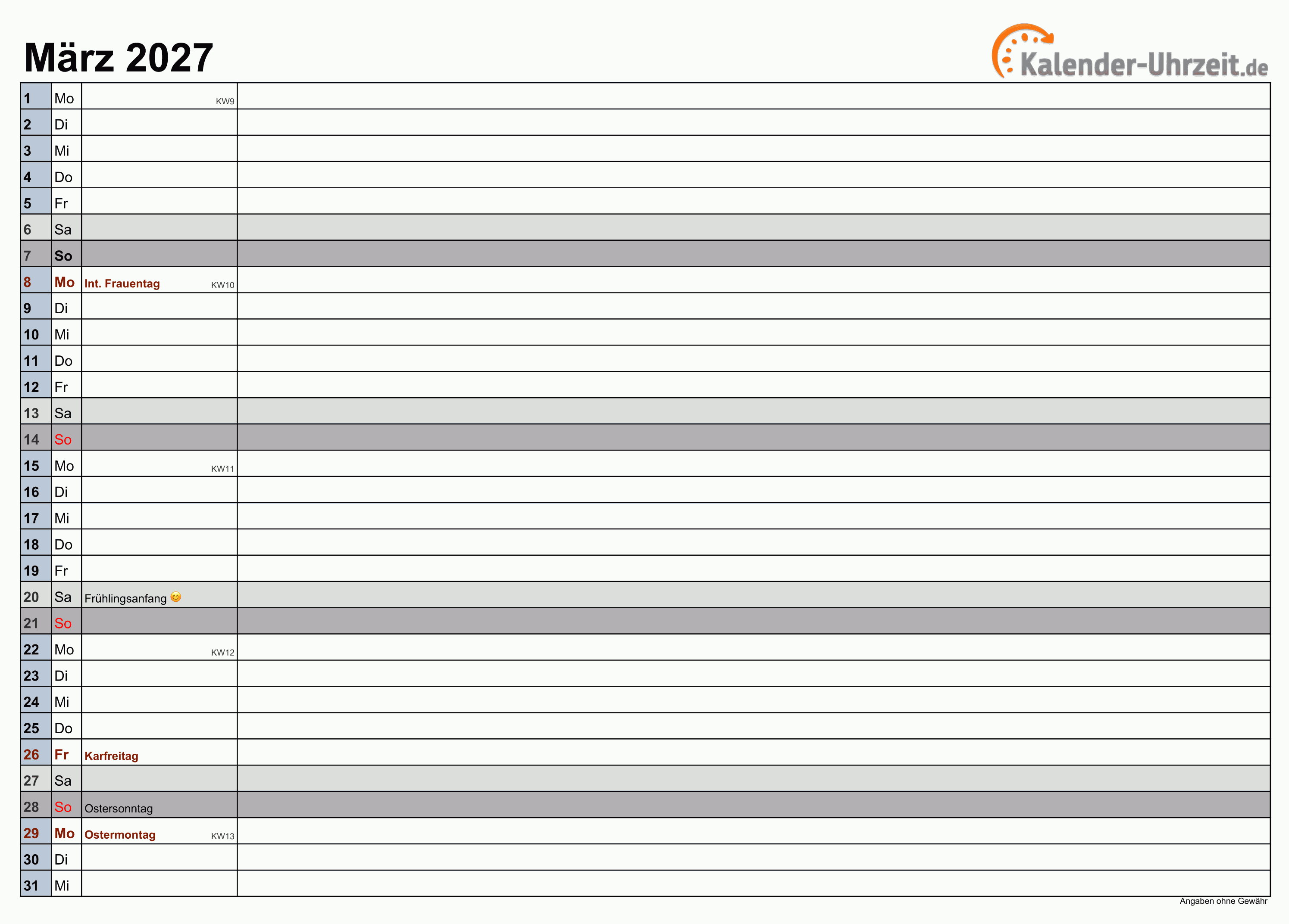 März 2027 Kalender Ausdrucken