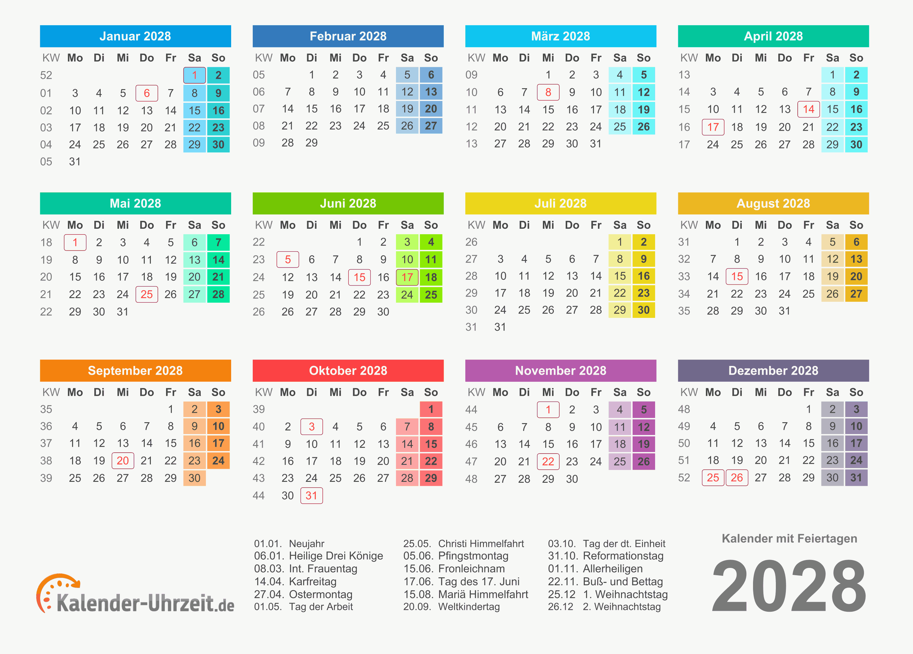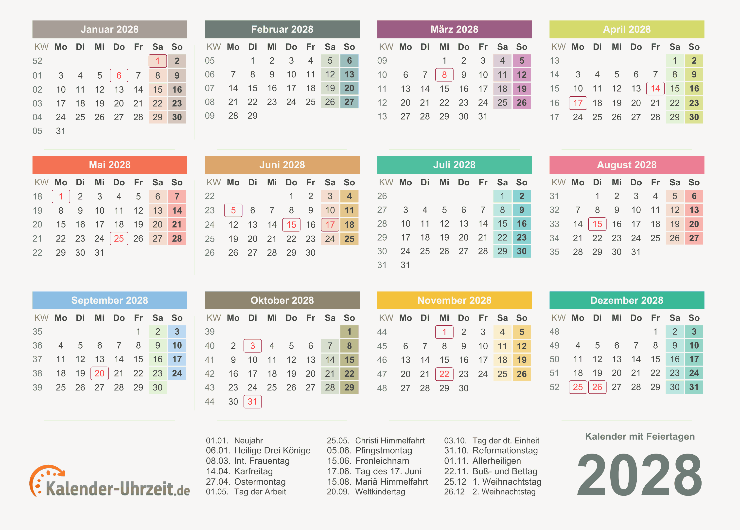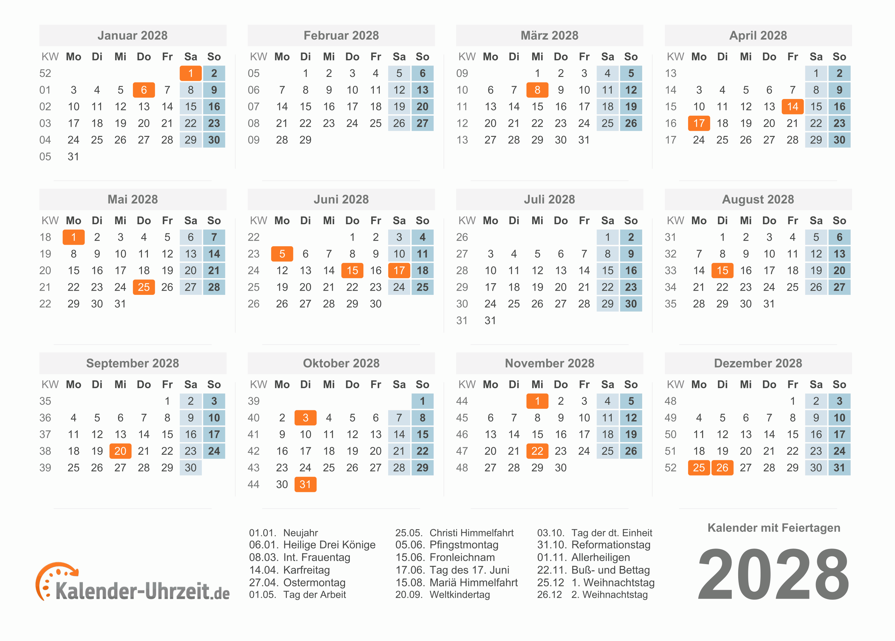 Kalender 2028 mit Feiertagen