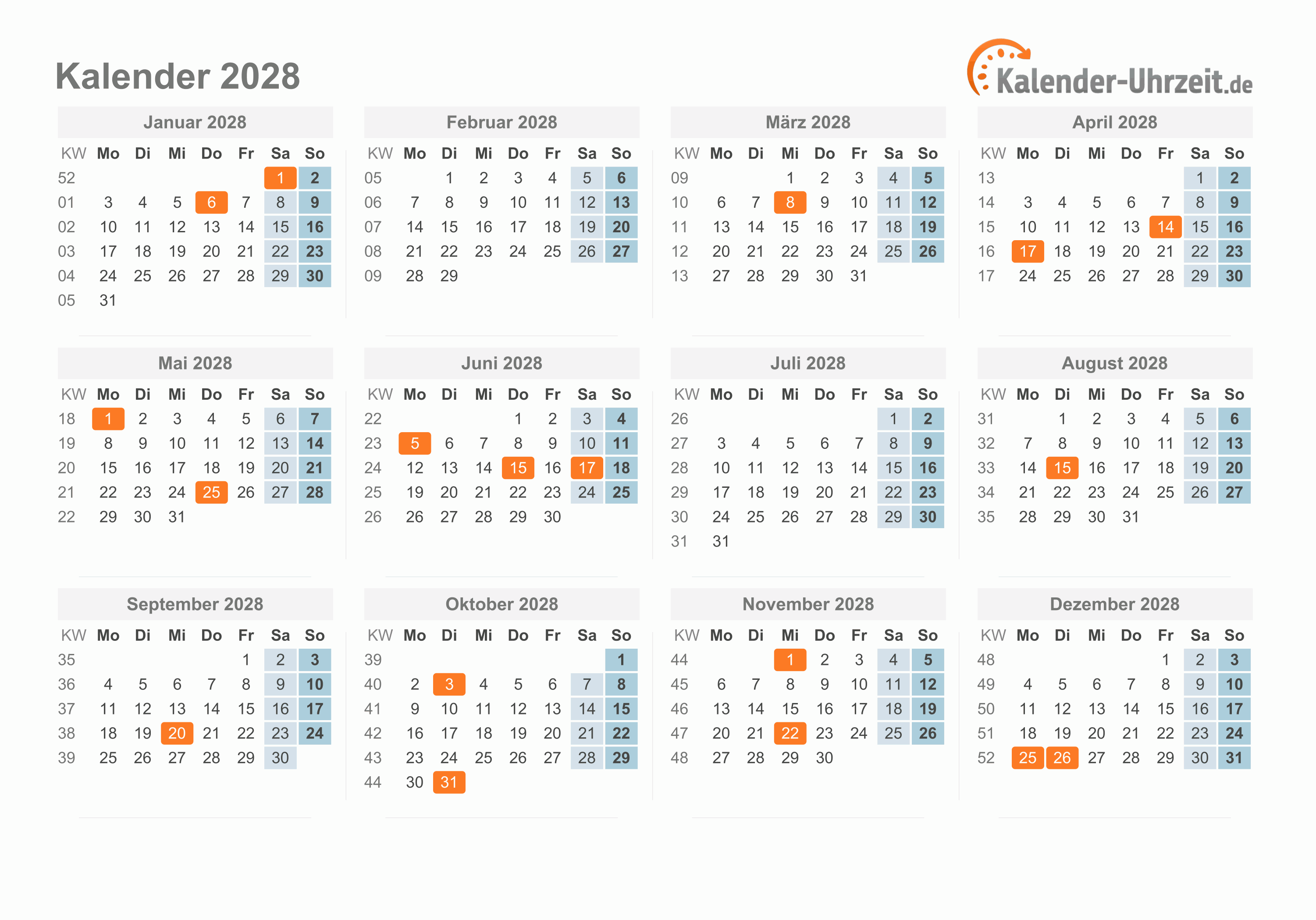 Hier finden Sie eine kleine Auswahl unserer Kalender 2028 mit Feiertagen und Kalenderwochen als PDF- oder EXCEL-Datei. Weiterhin haben wir viele A4- und A5-Vorlagen als PDF-Kalender 2028 sowie Excel-Kalender 2028 für Sie vorbereitet. Mit unserem Kalendergenerator können Sie schnell und einfach individuelle Jahres-, Quartals- und Monatskalender erstellen. Unser Angebot ist für Sie kostenlos!