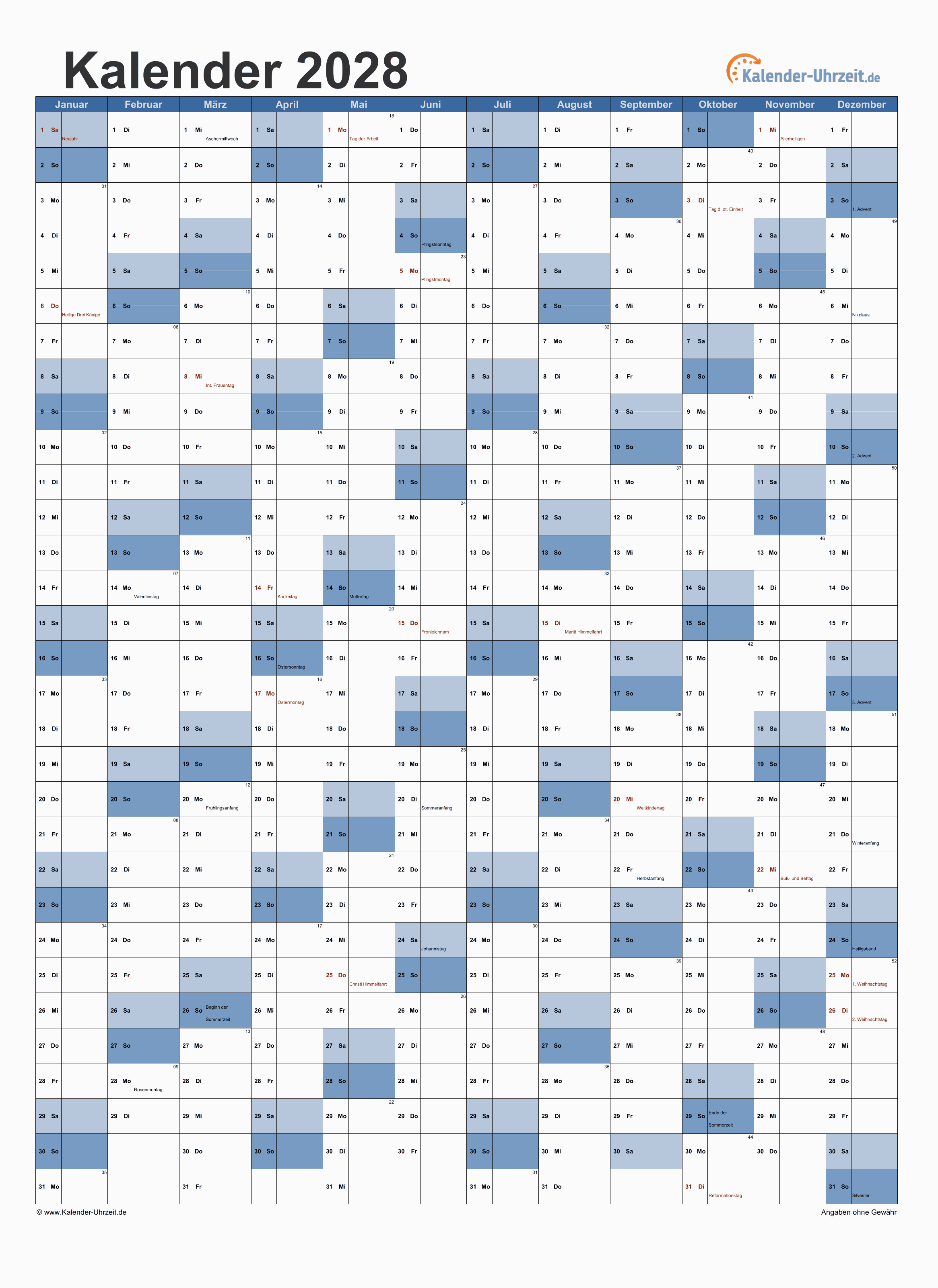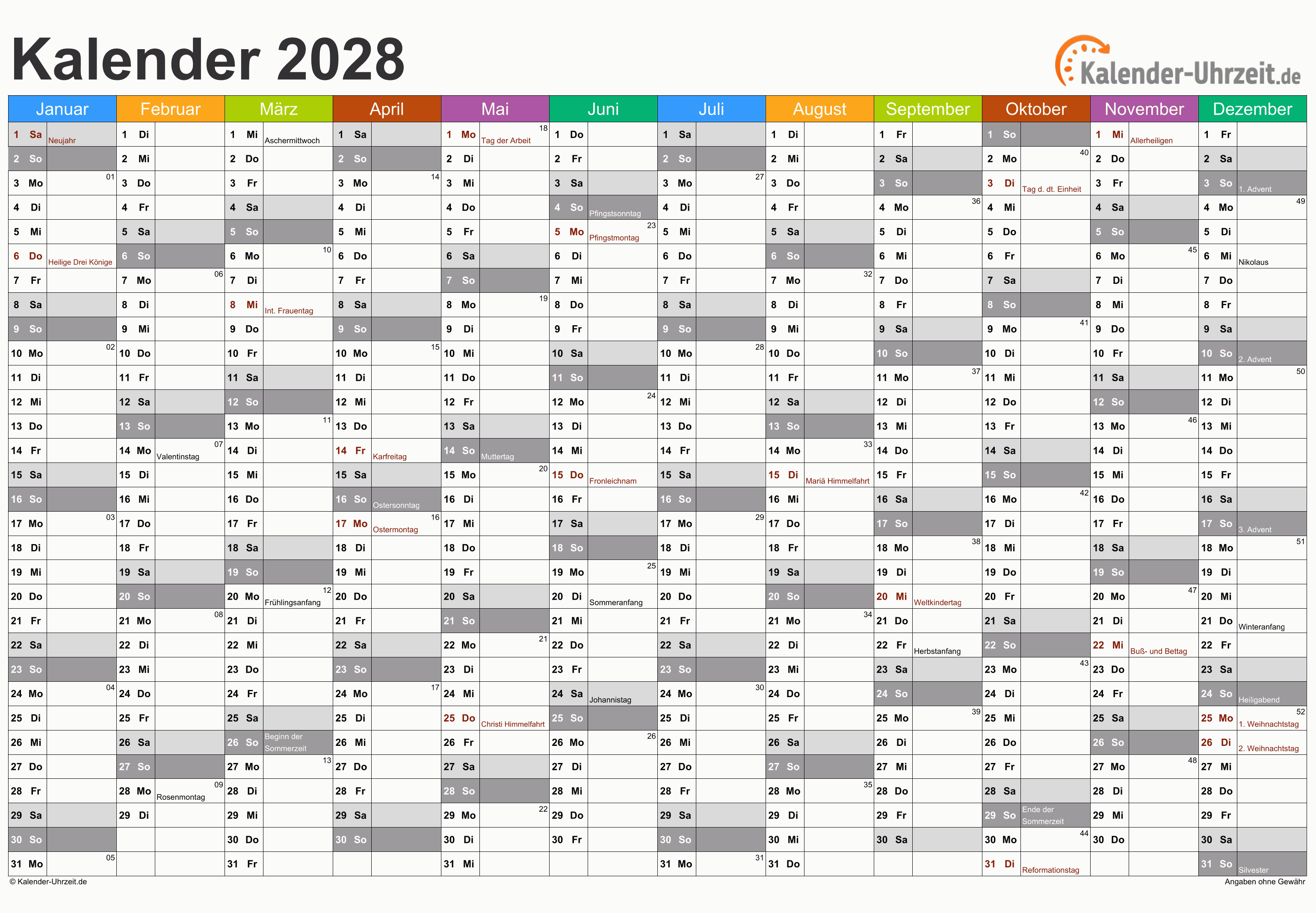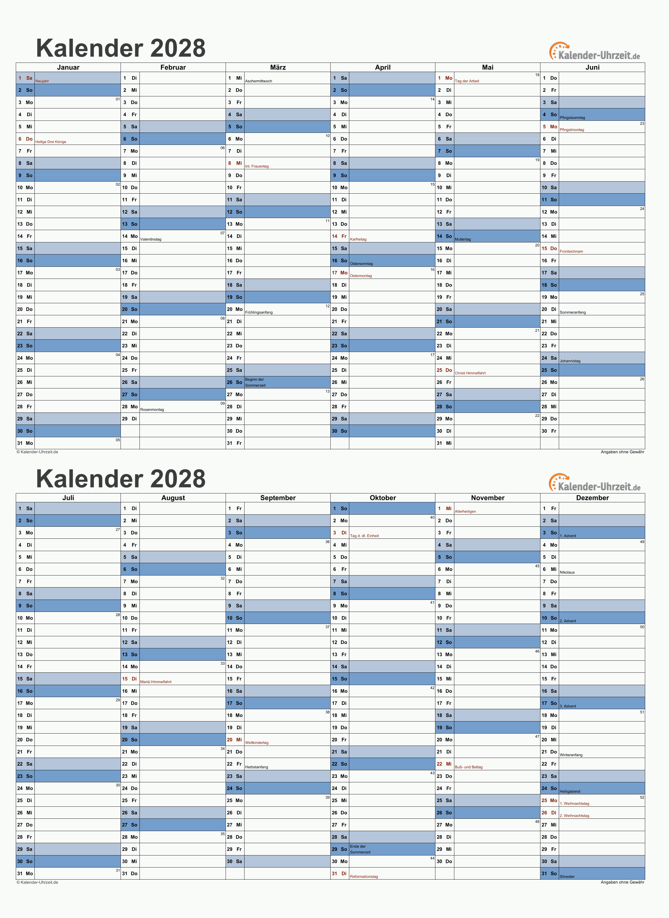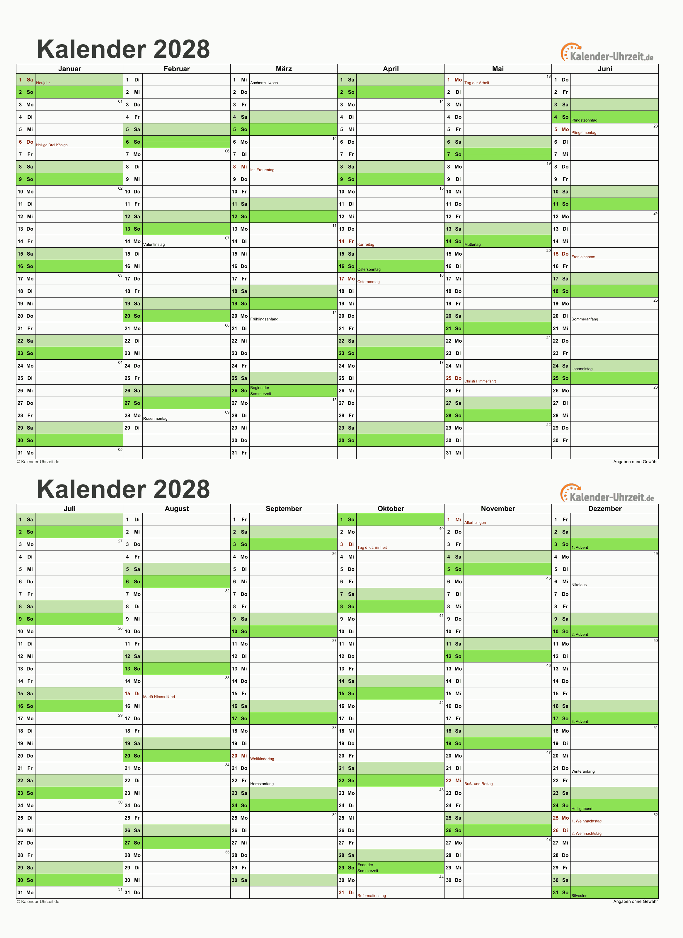Die folgenden Kalender 2028 zum Ausdrucken eignen sich sowohl als Vorlage für den ganzseiten Ausdruck im DIN A4 Querformat, also auch für den halbseiten Ausdruck im Hochformat als DIN A5 Kalender. Die PDF-Kalender können bspw. als Jahresübersicht im Taschenkalender, als Bürokalender für die Schreibunterlage oder an die Wand gepinnt zum Einsatz kommen und erleichtern somit Ihre Terminplanung. In jedem Kalender sind die gesetzlichen Feiertage 2028 farblich markiert. Unser Angebot der PDF-Kalender 2028 ist für Sie kostenlos!