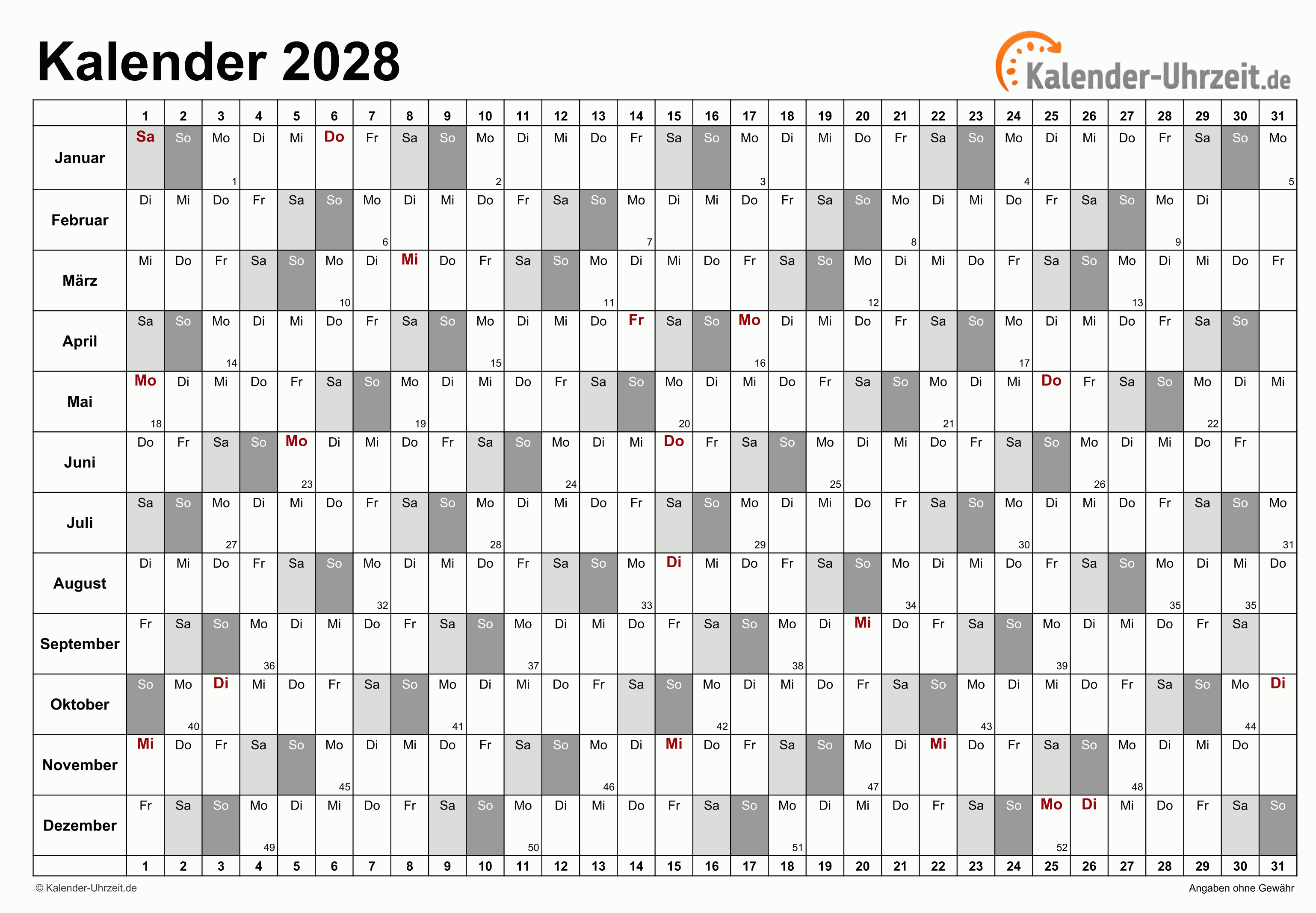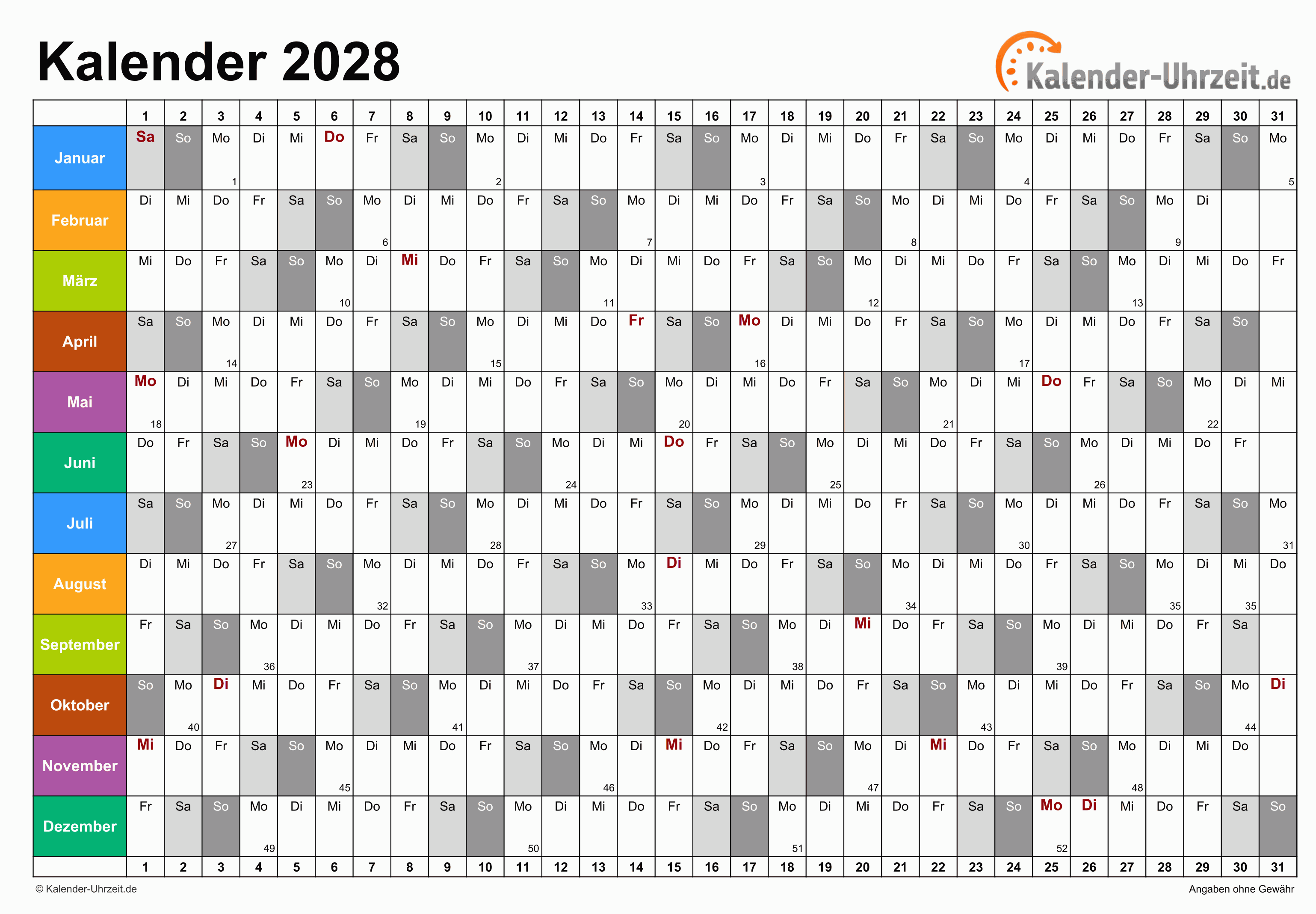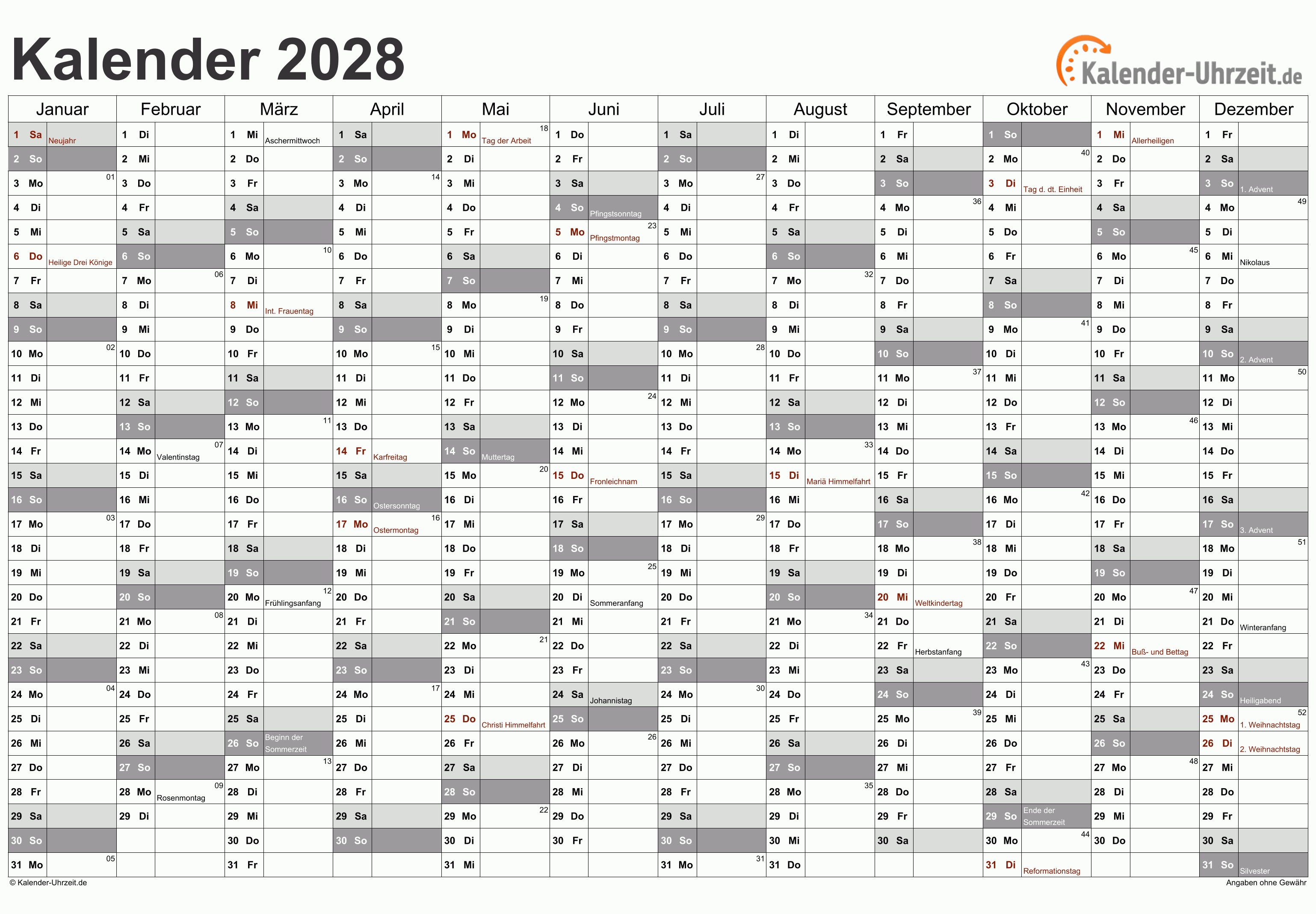 Die folgenden Kalender 2028 zum Ausdrucken eignen sich sowohl als Vorlage für den ganzseiten Ausdruck im DIN A4 Querformat, also auch für den halbseiten Ausdruck im Hochformat als DIN A5 Kalender. Die PDF-Kalender können bspw. als Jahresübersicht im Taschenkalender, als Bürokalender für die Schreibunterlage oder an die Wand gepinnt zum Einsatz kommen und erleichtern somit Ihre Terminplanung. In jedem Kalender sind die gesetzlichen Feiertage 2028 farblich markiert. Unser Angebot der PDF-Kalender 2028 ist für Sie kostenlos!