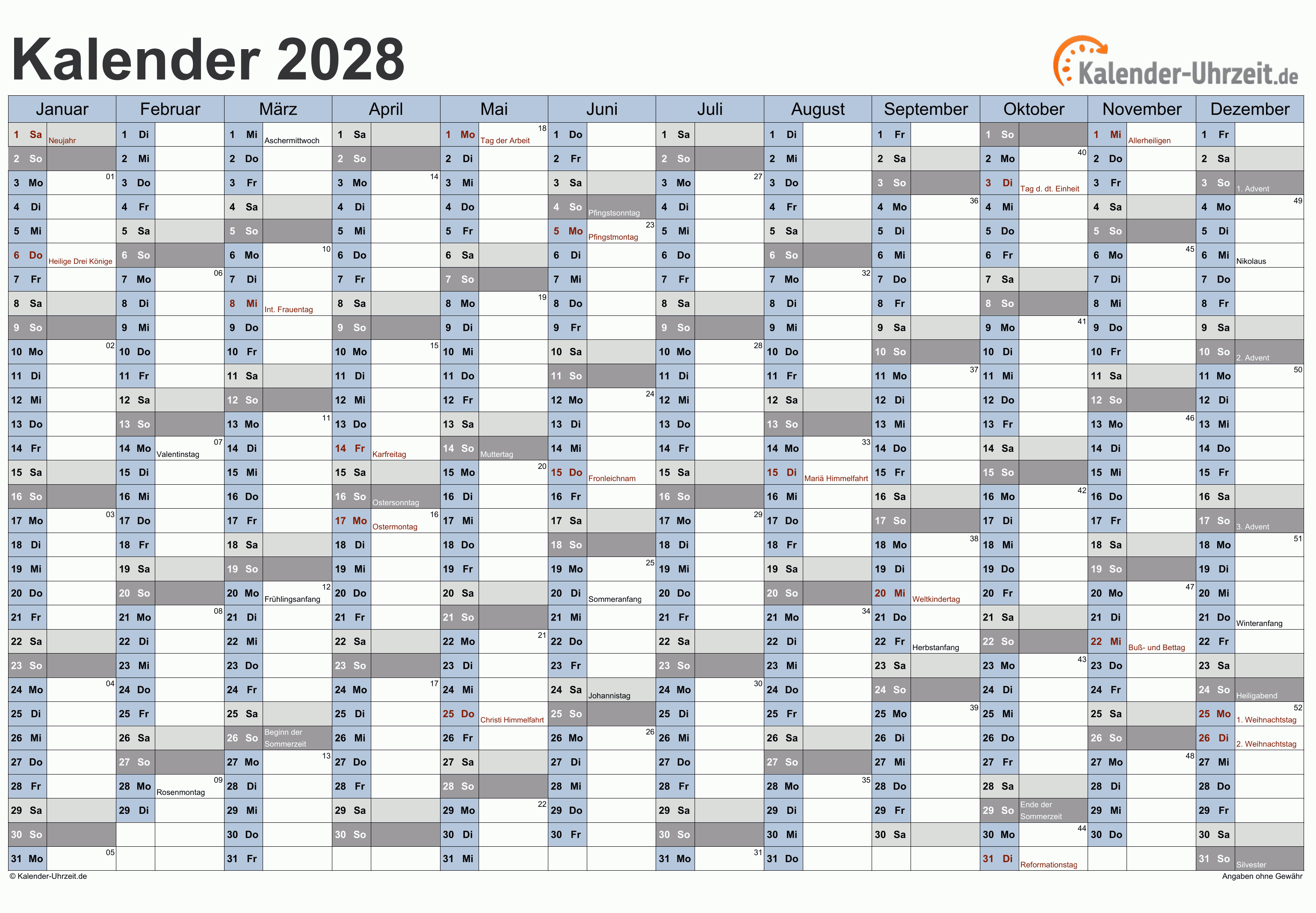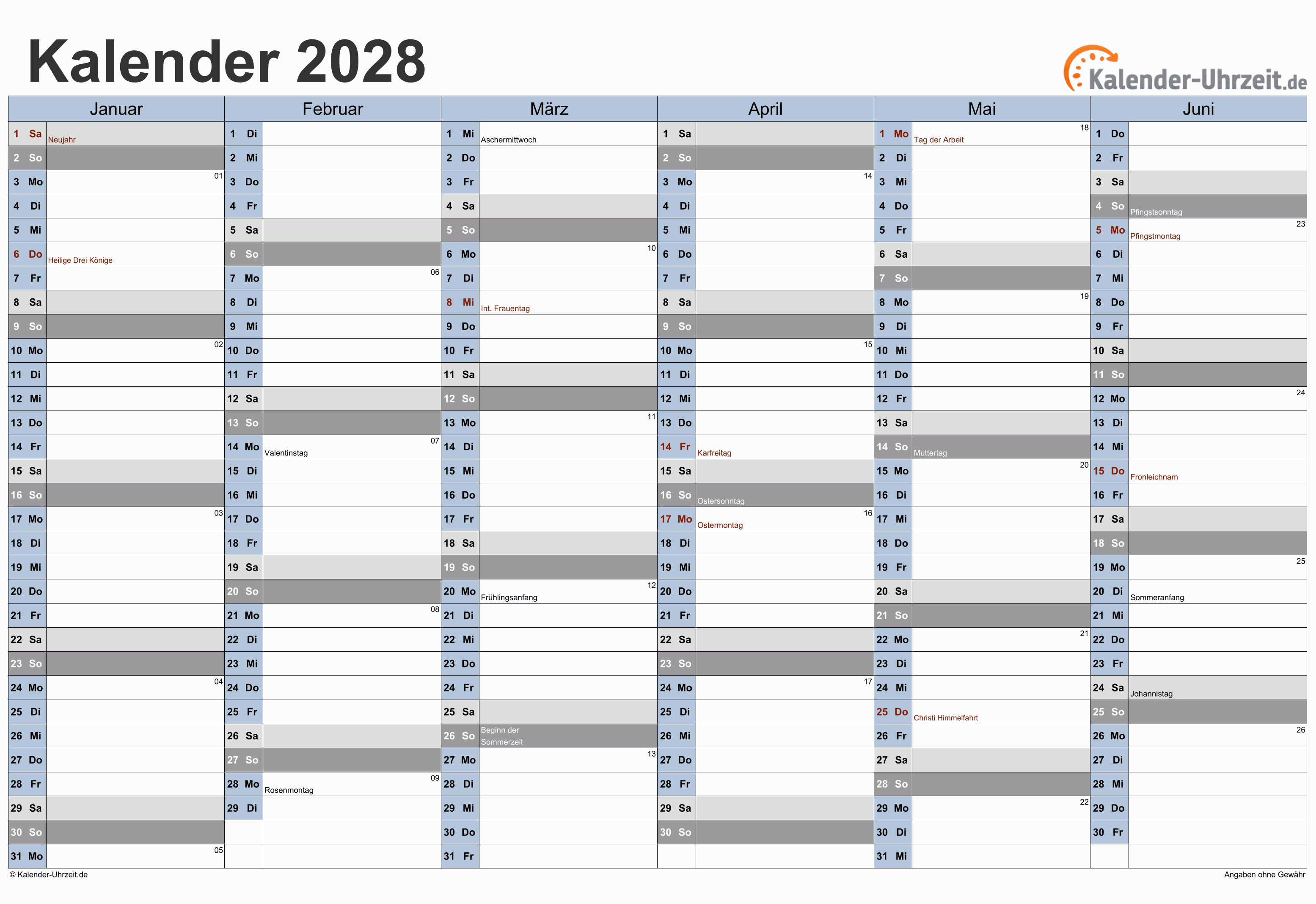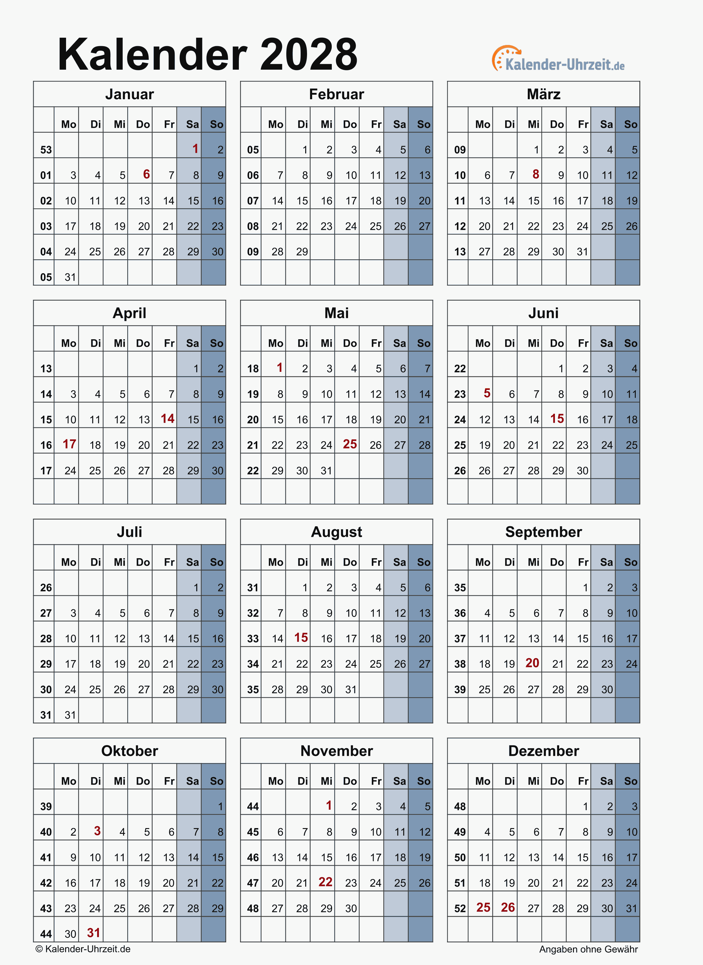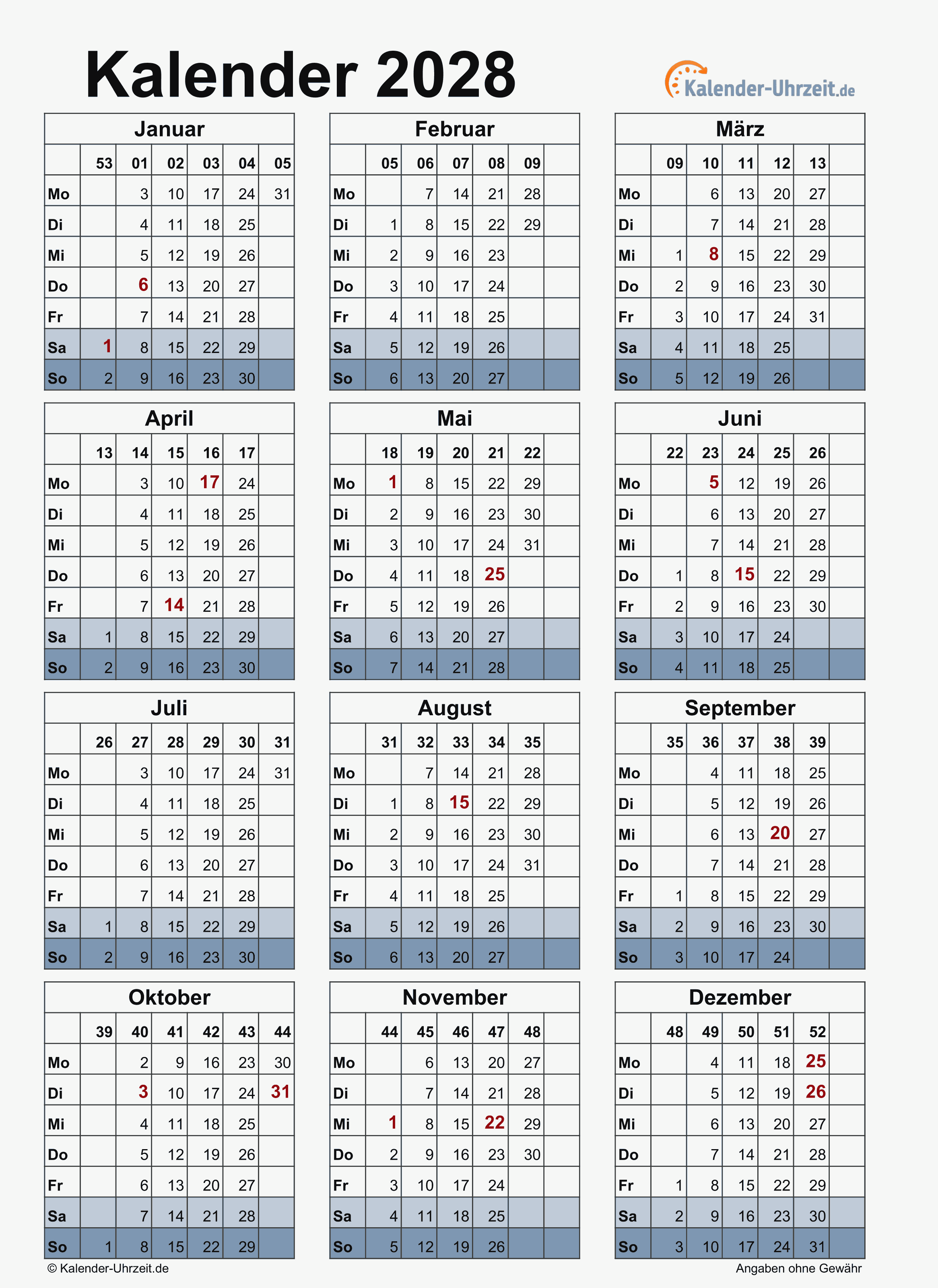 Die folgenden Kalender 2028 zum Ausdrucken eignen sich sowohl als Vorlage für den ganzseiten Ausdruck im DIN A4 Querformat, also auch für den halbseiten Ausdruck im Hochformat als DIN A5 Kalender. Die PDF-Kalender können bspw. als Jahresübersicht im Taschenkalender, als Bürokalender für die Schreibunterlage oder an die Wand gepinnt zum Einsatz kommen und erleichtern somit Ihre Terminplanung. In jedem Kalender sind die gesetzlichen Feiertage 2028 farblich markiert. Unser Angebot der PDF-Kalender 2028 ist für Sie kostenlos!