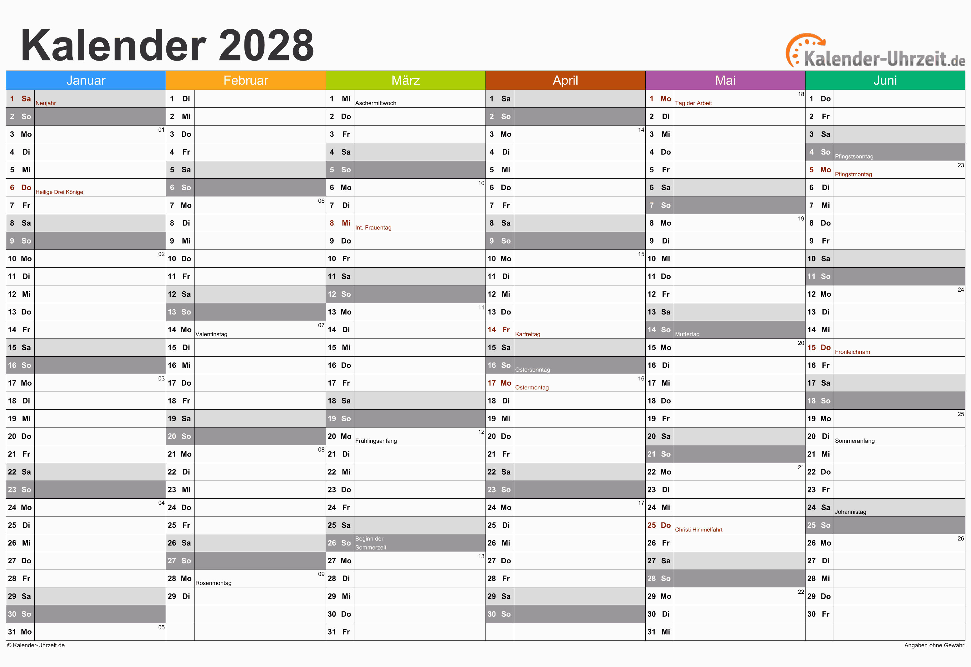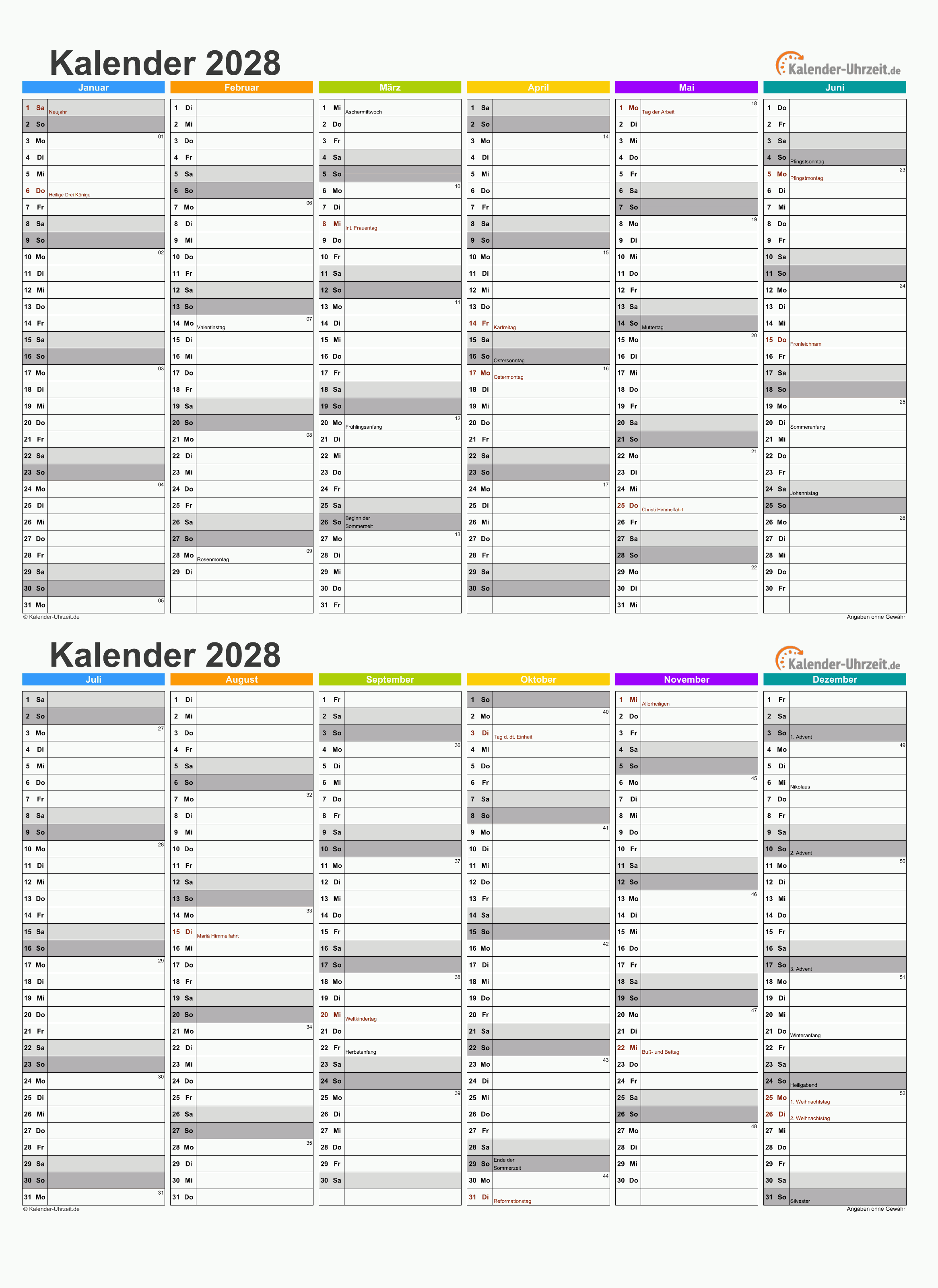 Die PDF Halbjahreskalender 2028 bilden das Kalenderjahr auf zwei DIN A4-Seiten im Querformat ab. Kalenderwochen und gesetzliche Feiertage sind in jedem der drei Farbschemen markiert. Der ideale Kalender für Firmen, Verwaltungen und Vereine.