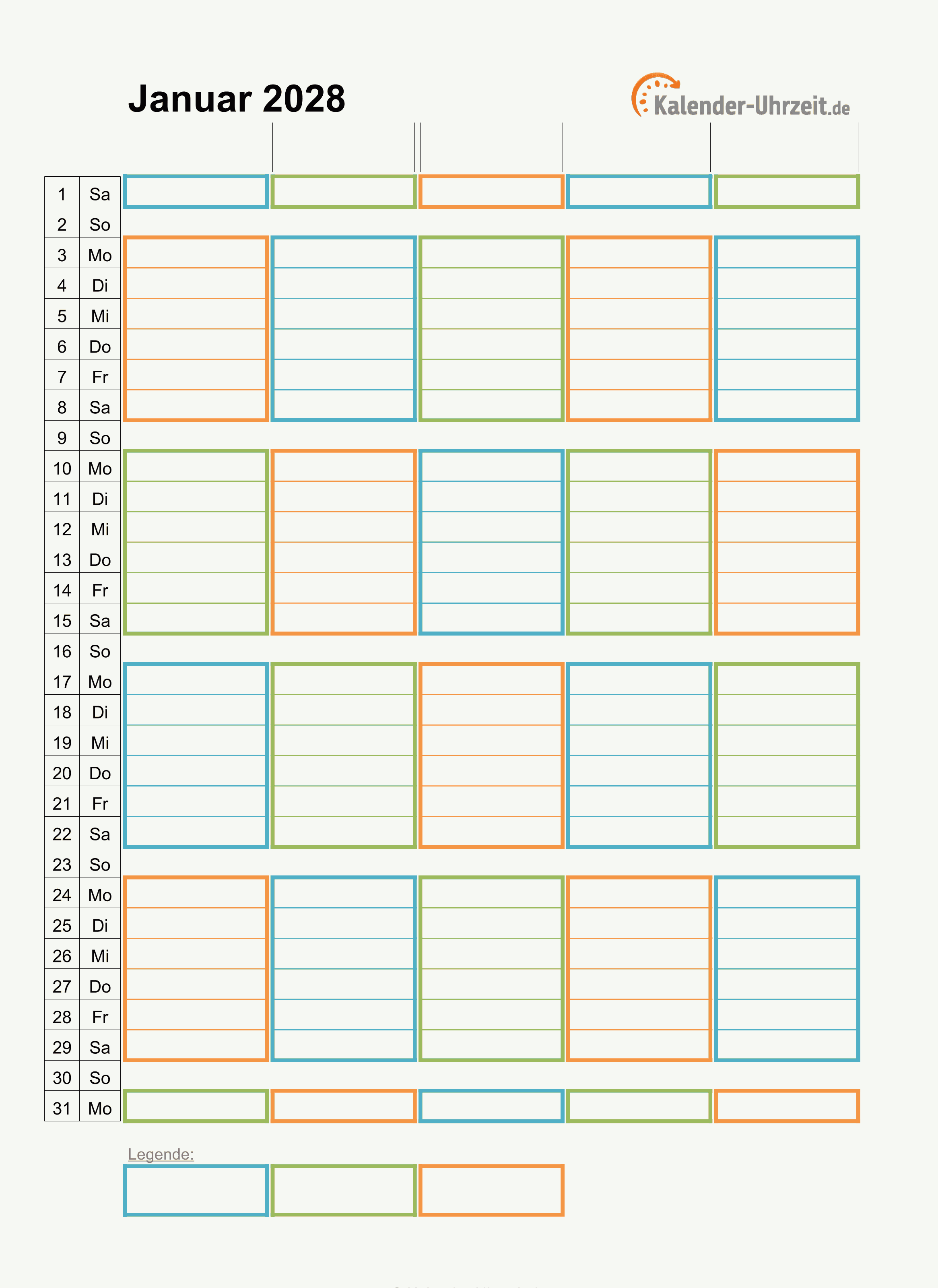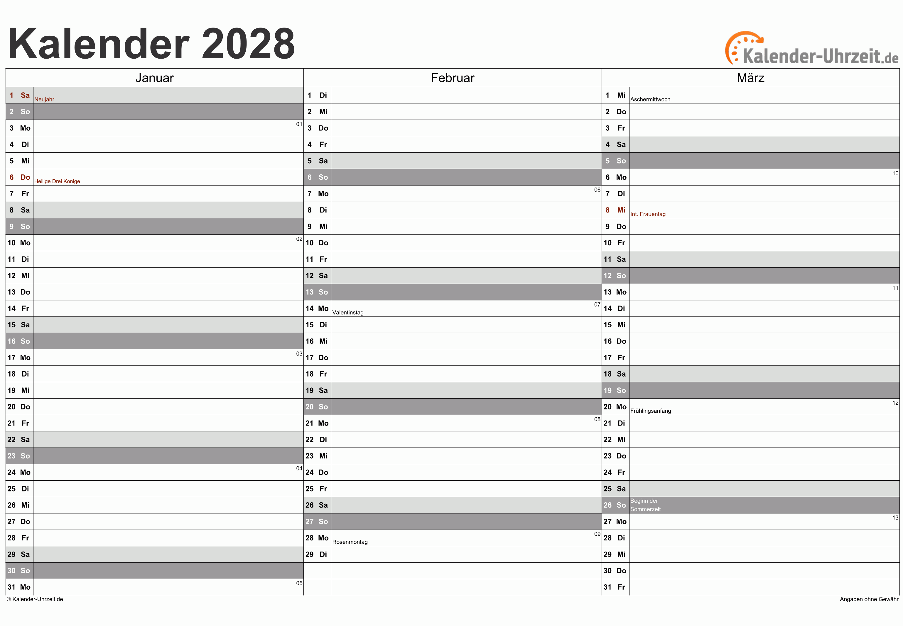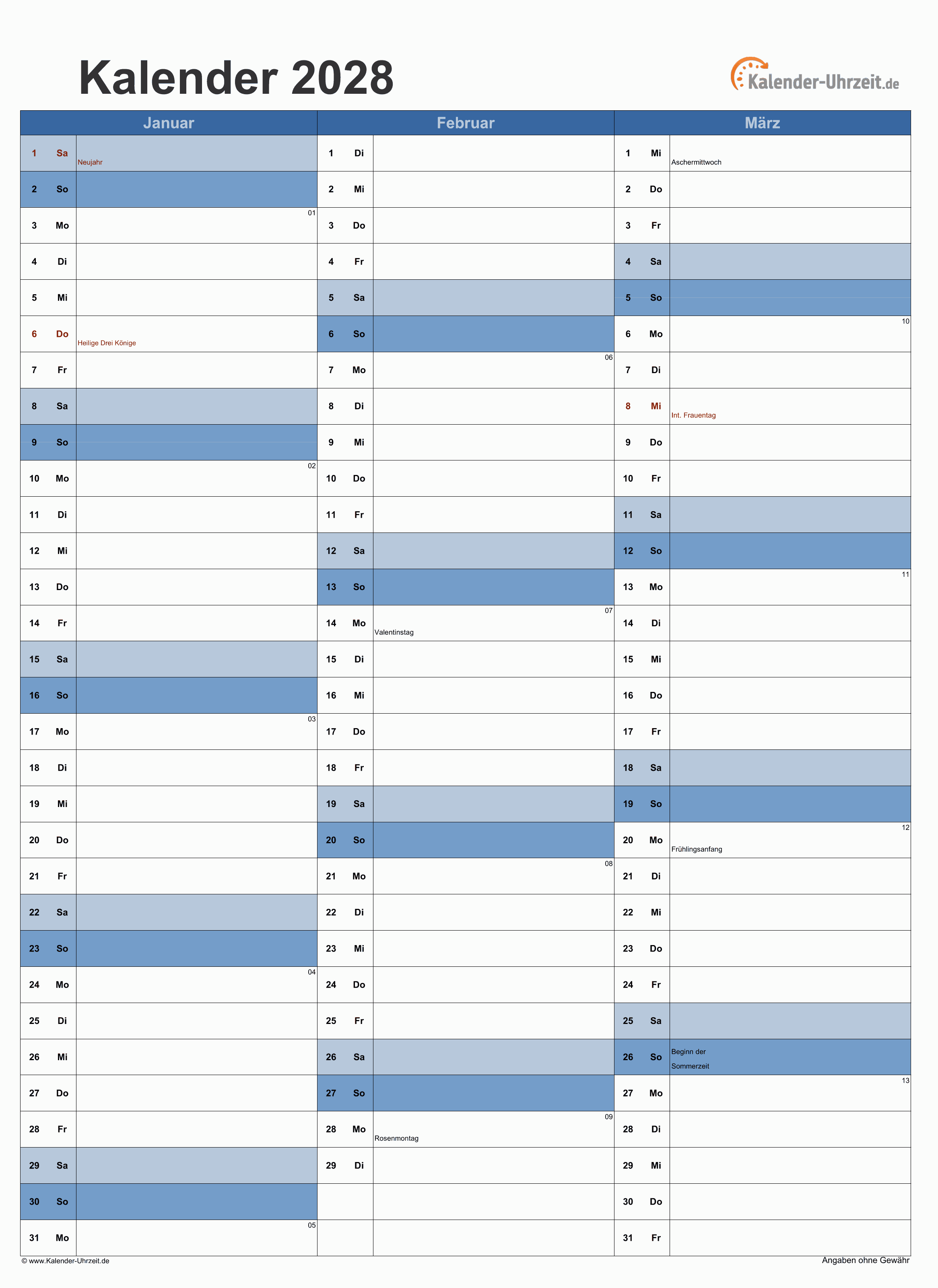 Kalender 2028 zum Ausdrucken - Spaltenansicht