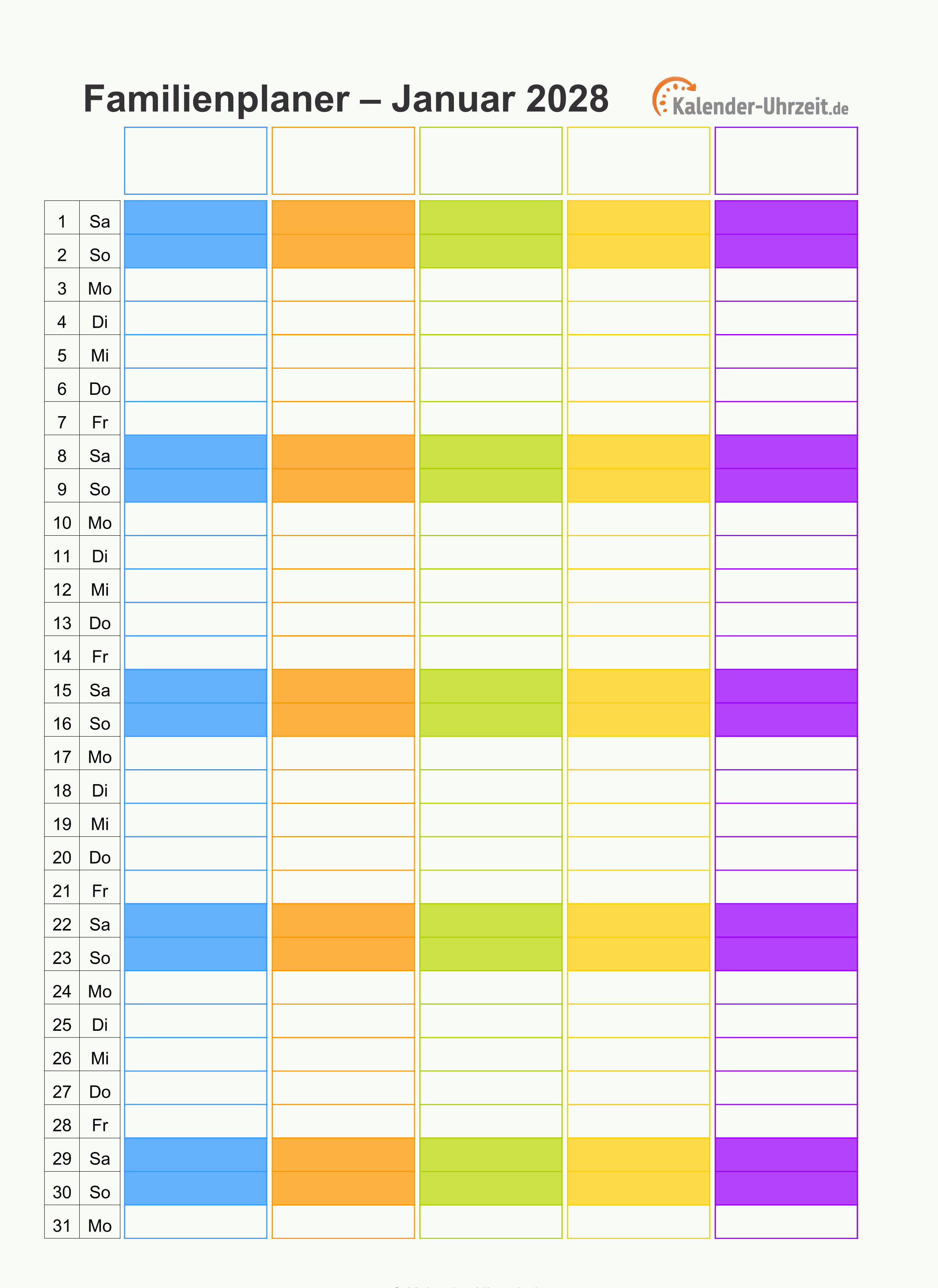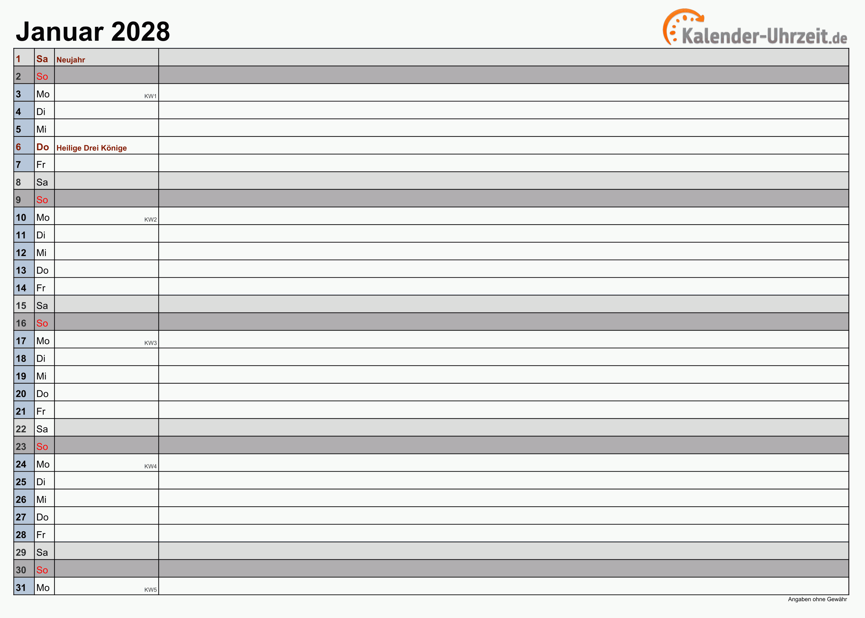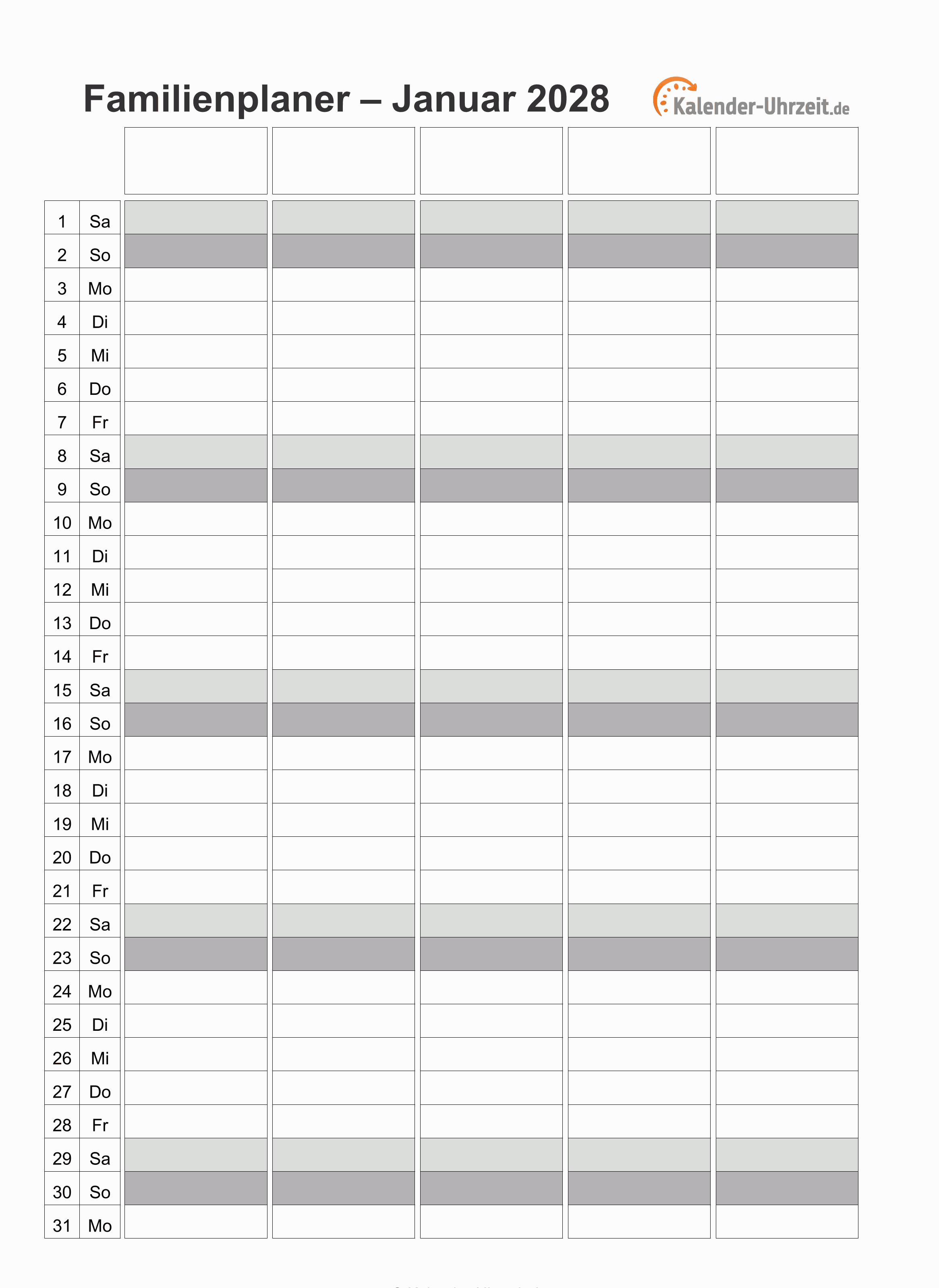 Kalender 2028 zum Ausdrucken - Spaltenansicht