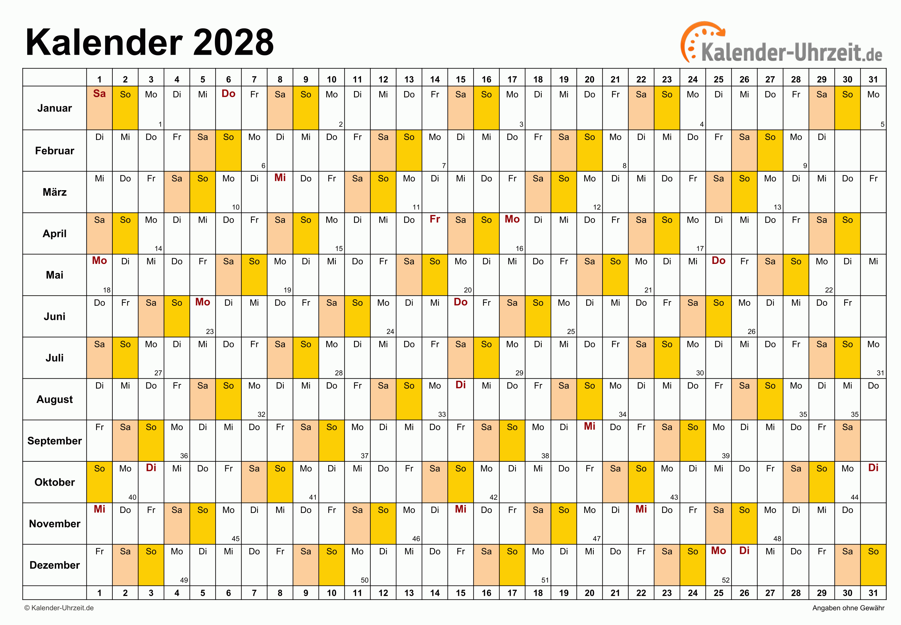Jahreskalender 2028 im PDF-Format: 1-seitig - A4-Querformat