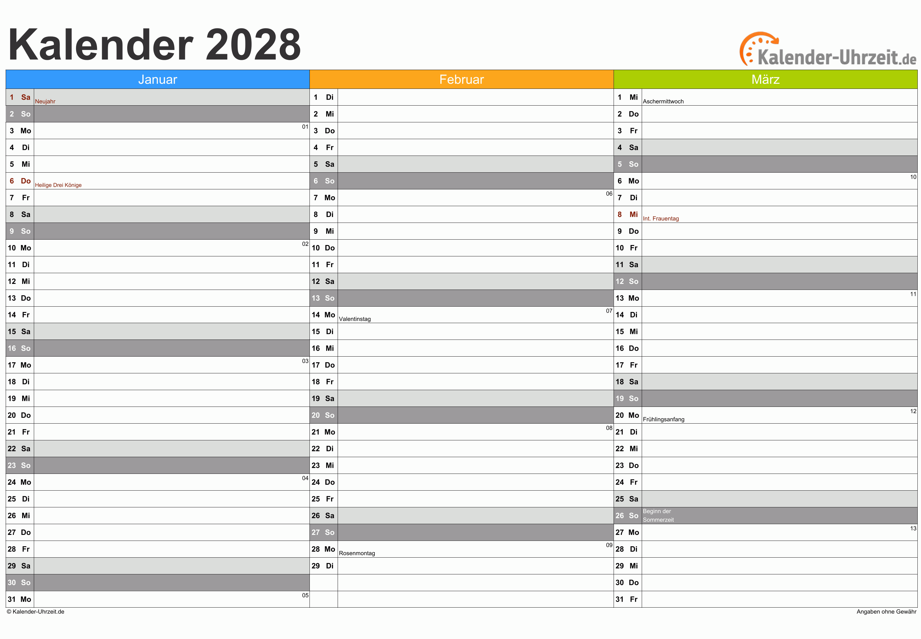 Unsere PDF Quartalskalender 2028 verteilen das Kalenderjahr auf vier DIN A4-Seiten im Querformat. So bietet der Kalender viel Platz für Notizen, was ihn zu einem hervorragenden Terminkalender macht. In allen drei Farbschemen sind die gesetzlichen Feiertage und Kalenderwochen entsprechend markiert.