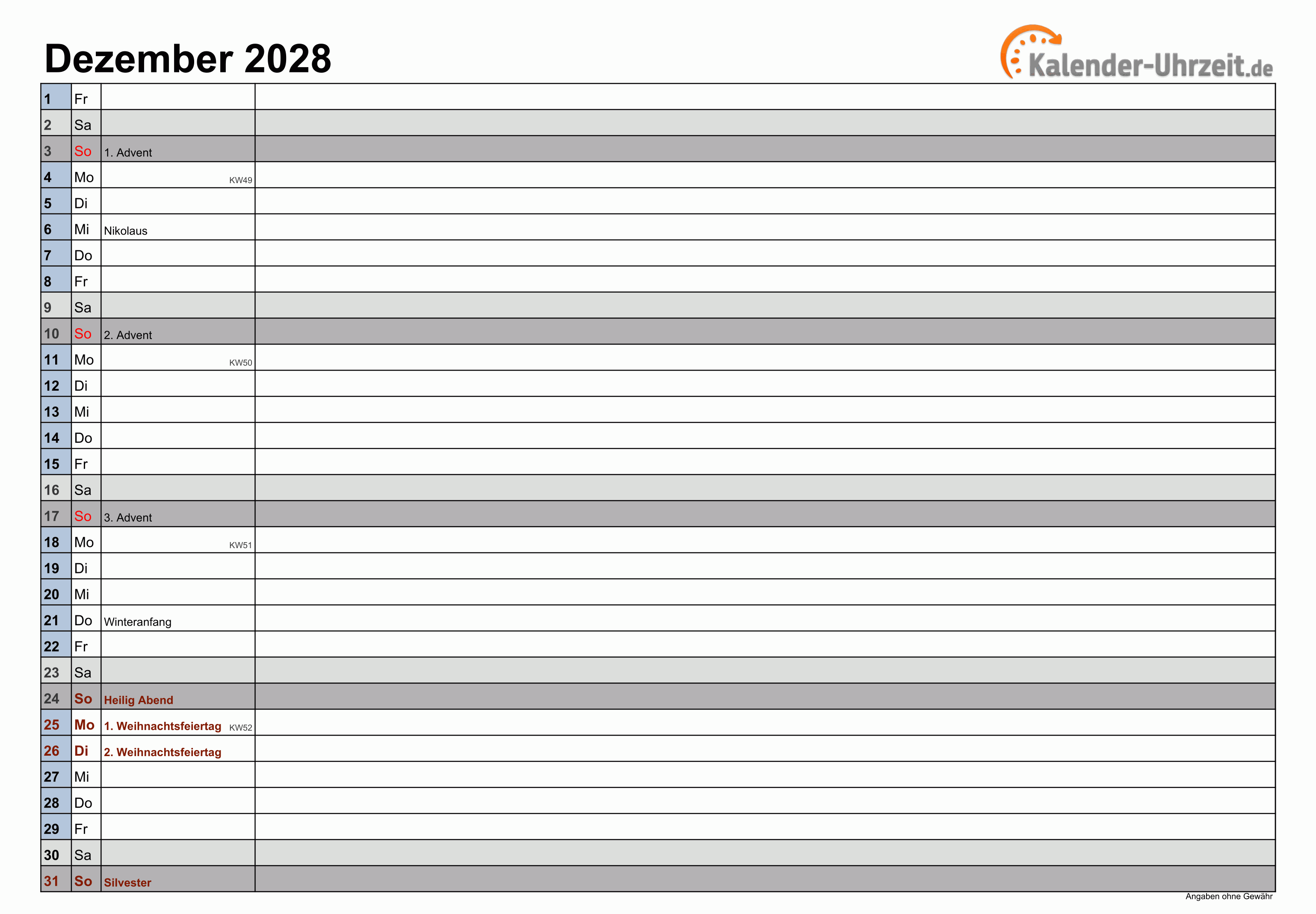 Legende zum Kalender Dezember 2028 mit Feiertagen