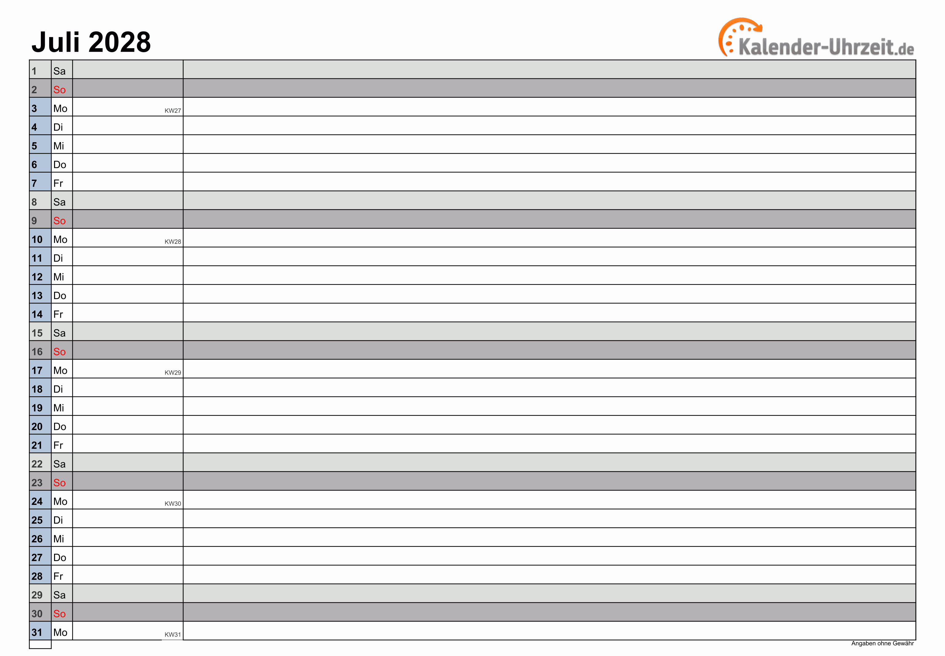 Legende zum Kalender Juli 2028 mit Feiertagen