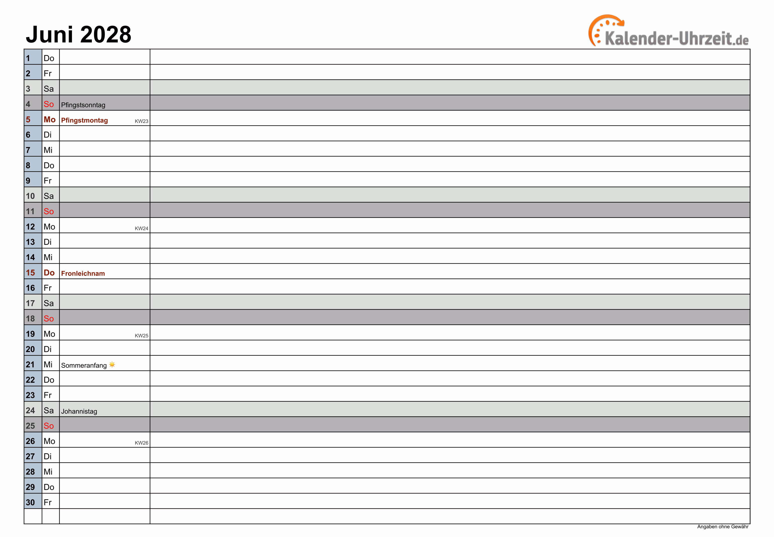 Legende zum Kalender Juni 2028 mit Feiertagen